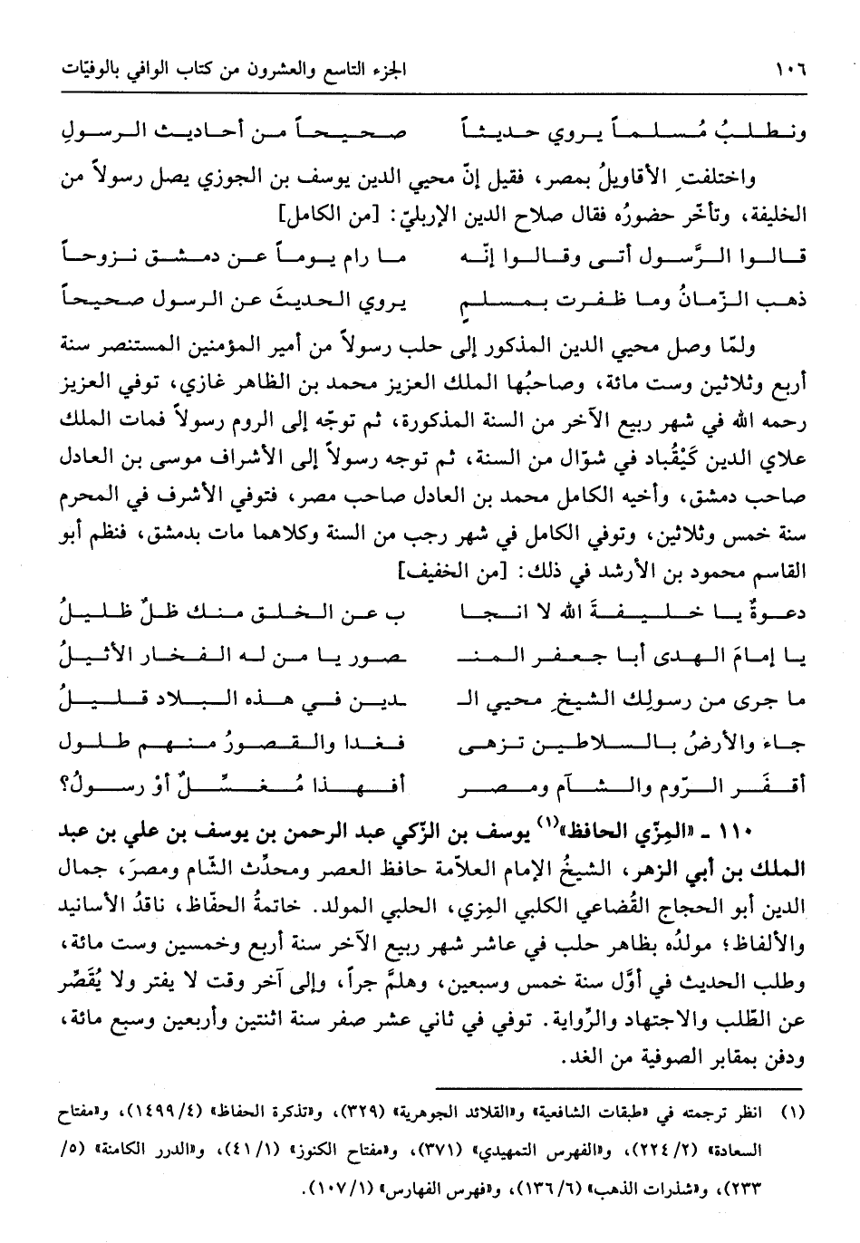 110 - الْمزي الْحَافِظ يُوسُف بن الزكي عبد الرَّحْمَن بن يُوسُف بن عَليّ بن عبد الْملك بن أبي الزهر الشَّيْخ الإِمَام الْعَلامَة حَافظ الْعَصْر ومحدث الشَّام ومصر جمال الدّين أَبُو الْحجَّاج الْقُضَاعِي الْكَلْبِيّ الْمزي الْحلَبِي المولد خَاتِمَة الْحفاظ ناقد الْأَسَانِيد والألفاظ مولده بِظَاهِر حلب فِي عَاشر شهر ربيع الآخر سنة أَربع وَخمسين وست مائَة وَطلب الحَدِيث فِي أول سنة خمس وَسبعين وهلم جرا وَإِلَى آخر وَقت لَا يفتر وَلَا يقصر عَن الطّلب وَالِاجْتِهَاد وَالرِّوَايَة توفّي فِي ثَانِي عشر صفر سنة اثْنَتَيْنِ وَأَرْبَعين وَسبع مائَة وَدفن بمقابر الصُّوفِيَّة من الْغَد