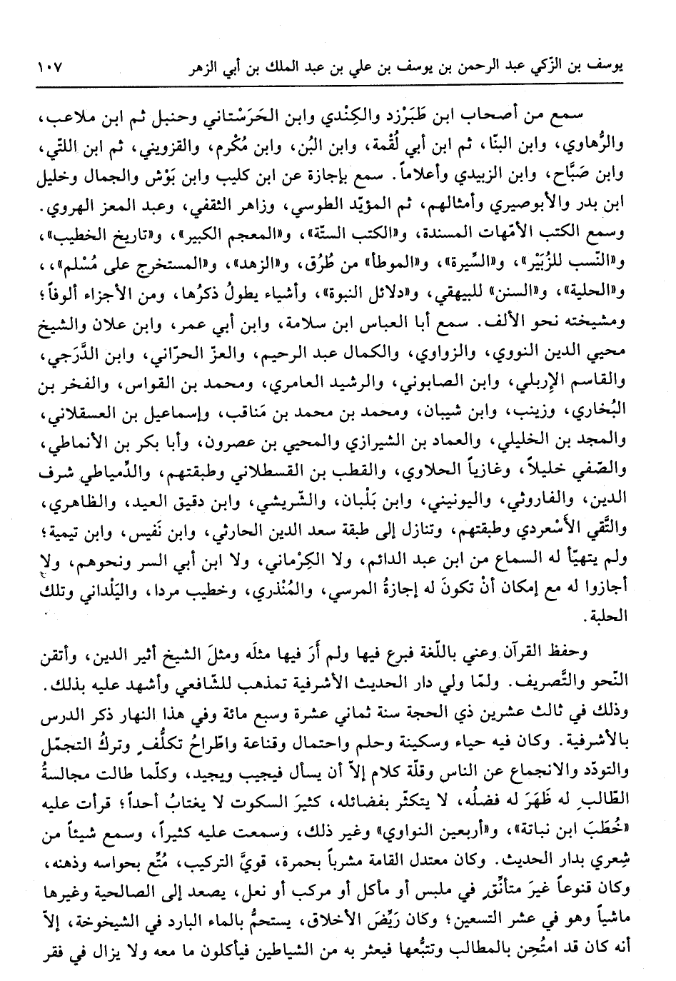 وَحفظ الْقُرْآن وعني باللغة فبرع فِيهَا وَلم أر فِيهَا مثله وَمثل الشَّيْخ أثير الدّين وأتقن النَّحْو والتصريف وَلما ولي دَار الحَدِيث الأشرفية تمذهب للشَّافِعِيّ وَأشْهد عَلَيْهِ بذلك وَذَلِكَ فِي ثَالِث عشْرين ذِي الْحجَّة سنة ثَمَانِي عشرَة وَسبع مائَة وَفِي هَذَا النَّهَار ذكر الدَّرْس بالأشرفية وَكَانَ فِيهِ حَيَاء وسكينة وحلم وَاحْتِمَال وقناعة واطراح تكلّف وَترك التجمل والتودد والانجماع عَن النَّاس وَقلة كَلَام غلا أَن يسْأَل فيجيب ويجيد وَكلما طَالَتْ مجالسة الطَّالِب لَهُ ظهر لَهُ فَضله لَا يتكثر بفضائله كثير السُّكُوت لَا يغتاب أحد قَرَأت عَلَيْهِ خطب ابْن نباتة وَأَرْبَعين النواوي وَغير ذَلِك وَسمعت عَلَيْهِ كثيرا وَسمع شَيْئا من شعري بدار الحَدِيث وَكَانَ معتدل الْقَامَة مشربا بحمرة قوي التَّرْكِيب متع بحواسه وذهنه وَكَانَ قنوعا غير متأنق فِي ملبس أَو مأكل أَو مركب أَو نعل يصعد إِلَى الصالحية وَغَيرهَا مَاشِيا وَهُوَ فِي عشر التسعين وَكَانَ ريض الْأَخْلَاق يستحم بِالْمَاءِ الْبَارِد فِي الشيخوخة إِلَّا أَنه كَانَ قد امتحن بالمطالب وتتبعها فيعثر بِهِ من الشَّيَاطِين فَيَأْكُلُونَ مَا مَعَه وَلَا يزَال فِي فقر