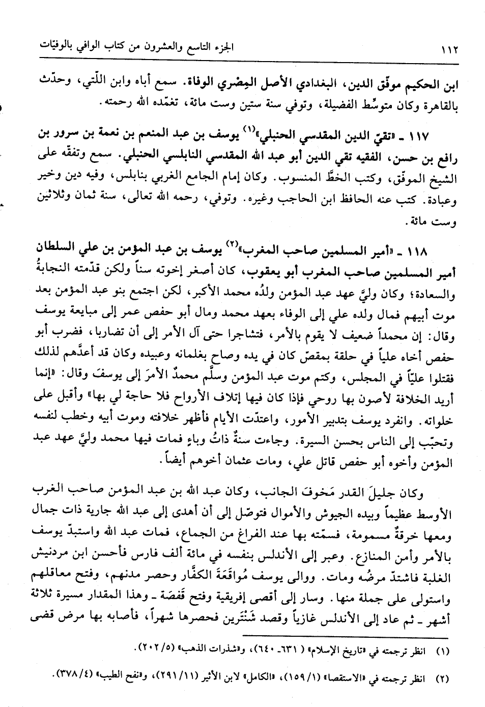 118 - أَمِير الْمُسلمين صَاحب الْمغرب يُوسُف بن عبد الْمُؤمن بن عَليّ السُّلْطَان أَمِير الْمُسلمين صَاحب الْمغرب أَبُو يَعْقُوب كَانَ أَصْغَر إخْوَته سنا وَلَكِن قَدمته النجابة والسعادة وَكَانَ ولي عهد عبد الْمُؤمن وَلَده مُحَمَّد الْأَكْبَر لَكِن اجْتمع بَنو عبد الْمُؤمن بعد موت أَبِيهِم فَمَال وَلَده عَليّ إِلَى الْوَفَاء بِعَهْد مُحَمَّد وَمَال أَبُو حَفْص عمر إِلَى مبايعة يُوسُف وَقَالَ إِن مُحَمَّدًا ضَعِيف لَا يقوم بِالْأَمر فتشاجرا حَتَّى آل الْأَمر إِلَى أَن تضاربا فَضرب أَبُو حَفْص أَخَاهُ عليا فِي حَلقَة بمقص كَانَ فِي يَده وَصَاح بغلمانه وعبيده وَكَانَ قد أعدهم لذَلِك فَقتلُوا عليا فِي المدلس وكتم موت عبد الْمُؤمن وَسلم مُحَمَّد الْأَمر إِلَى يُوسُف وَقَالَ إِنَّمَا أُرِيد الْخلَافَة لأصون بهَا روحي فَإِذا كَانَ فِيهَا إِتْلَاف الْأَرْوَاح فَلَا حَاجَة لي بهَا وَأَقْبل على خلواته وَانْفَرَدَ يُوسُف بتدبير الْأُمُور واعتدت الْأَيَّام فأظهر خِلَافَته وَمَوْت أَبِيه وخطب لنَفسِهِ وتحبب إِلَى النَّاس بِحسن السِّيرَة وَجَاءَت سنة ذَات وباء فَمَا فِيهَا مُحَمَّد ولي عهد عبد الْمُؤمن وَأَخُوهُ أَبُو حَفْص قَاتل عَليّ وَمَات عُثْمَان أخوهم أَيْضا