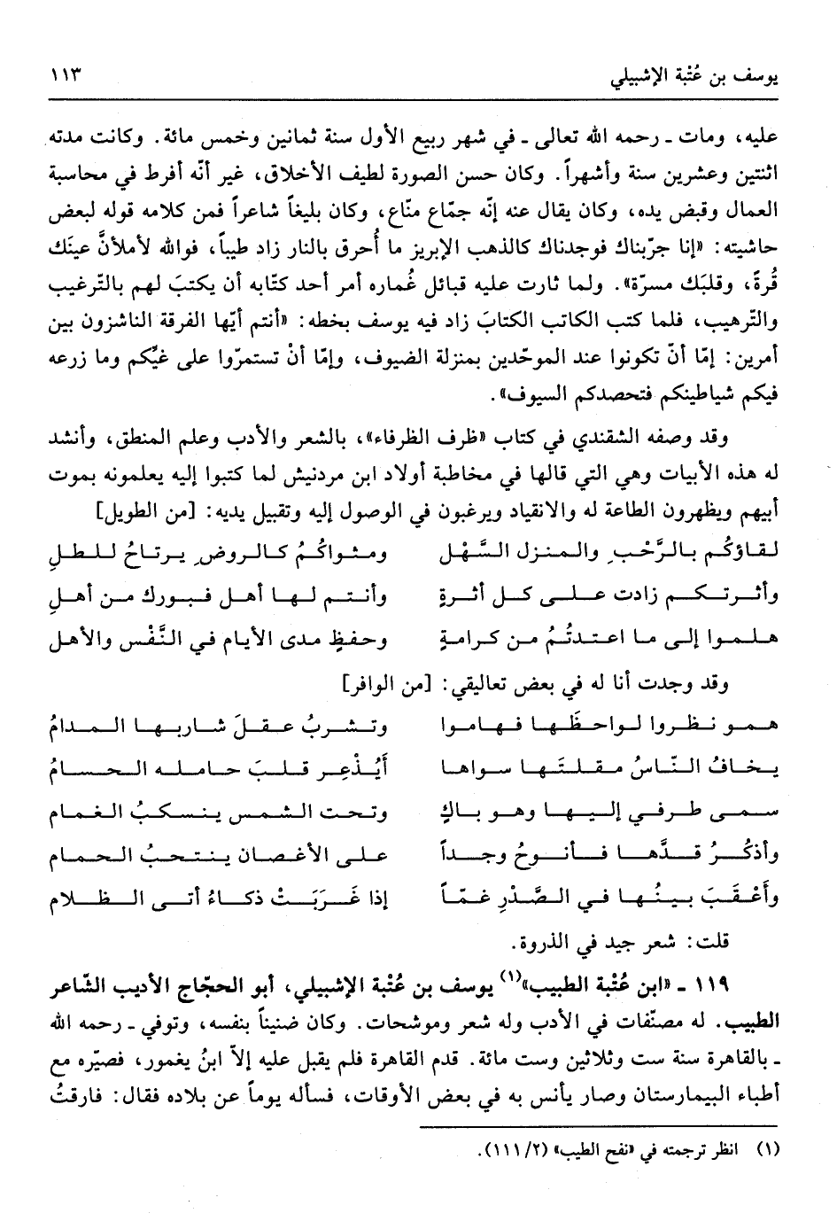 119 - ابْن عتبَة الطَّبِيب يُوسُف بن عتبَة الإشبيلي أَبُو الْحجَّاج الأديب الشَّاعِر الطَّبِيب لَهُ مصنفات فِي الْأَدَب وَله شعر وموشحات وَكَانَ ضنينا بِنَفسِهِ وَتُوفِّي رَحمَه الله بِالْقَاهِرَةِ سنة سِتّ وَثَلَاثِينَ وست مائَة قدم الْقَاهِرَة فَلم يقبل عَلَيْهِ إِلَّا ابْن يغمور فصيره مَعَ أطباء البيمارستان وَصَارَ يأنس بِهِ فِي بعض الْأَوْقَات فَسَأَلَهُ يَوْمًا عَن بِلَاده فَقَالَ فَارَقت