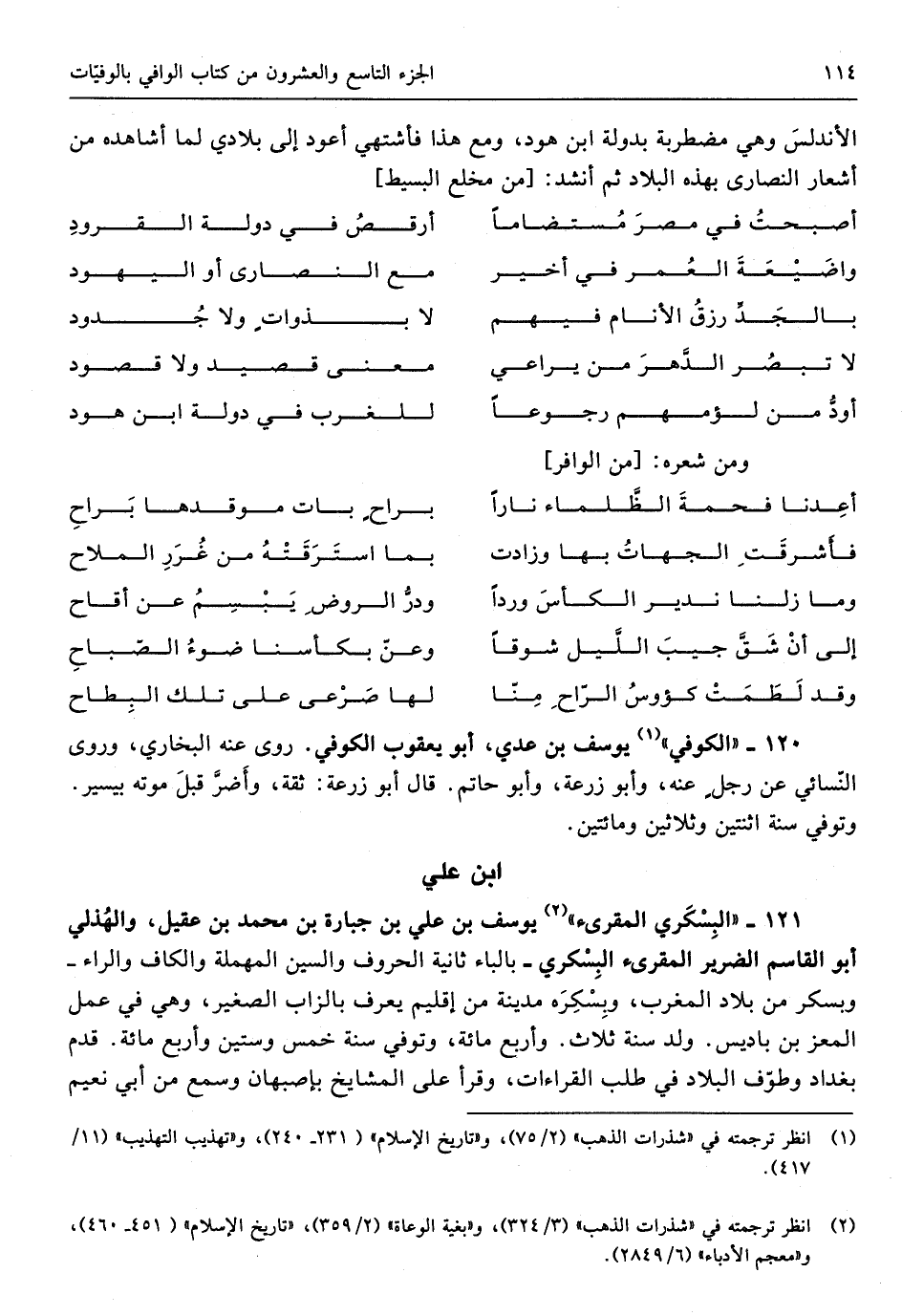 121 - البسكري الْمُقْرِئ يُوسُف بن عَليّ بن جبارَة بن مُحَمَّد بن عقيل والهذلي أَبُو الْقَاسِم الضَّرِير الْمُقْرِئ البسكري بِالْبَاء ثَانِيَة الْحُرُوف وَالسِّين الْمُهْملَة وَالْكَاف وَالرَّاء وبسكر من بِلَاد الْمغرب وبسكره مَدِينَة من إقليم يعرف بالزاب الصَّغِير وَهِي فِي عمل الْمعز بن باديس ولد سنة ثَلَاث وَأَرْبع مائَة وَتُوفِّي سنة خمس وَسِتِّينَ وَأَرْبع مائَة قدم بَغْدَاد وطوف الْبِلَاد فِي طلب الْقرَاءَات وَقَرَأَ على الْمَشَايِخ بإصبهان وَسمع من أبي نعيم