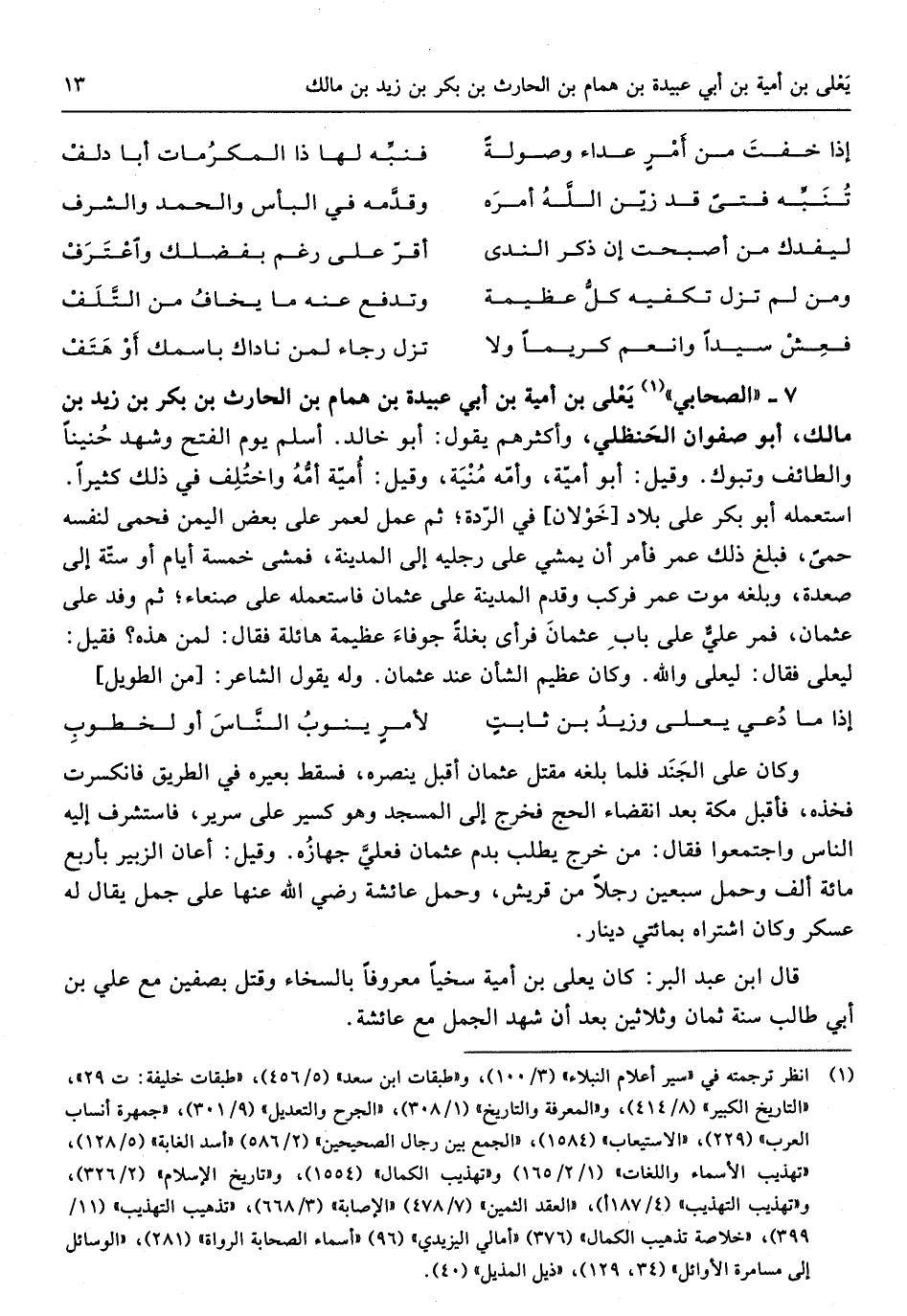7 - الصَّحَابِيّ يعلى بن أُميَّة بن أبي عُبَيْدَة بن همام بن الْحَارِث بن بكر بن زيد بن مَالك أَبُو صَفْوَان الْحَنْظَلِي وَأَكْثَرهم يَقُول أَبُو خَالِد أسلم يَوْم الْفَتْح وَشهد حنينا والطائف وتبوك وَقيل أَبُو أُميَّة وَأمه منية وَقيل أُميَّة أمه وَاخْتلف فِي ذَلِك كثيرا اسْتَعْملهُ أَبُو بكر على بِلَاد خولان فِي الرِّدَّة ثمَّ عمل لعمر على بعض الْيمن فحمى لنسفه حمى فَبلغ ذَلِك عمر فأمير أَن يمشى على رجلَيْهِ إِلَى الْمَدِينَة فَمشى خَمْسَة أَيَّام أَو سِتَّة إِلَى صعدة وبلغه موت عمر فَركب وَقدم الْمَدِينَة على عُثْمَان فَاسْتَعْملهُ على صنعاء ثمَّ وَفد على عُثْمَان فَمر عَليّ على بَاب عُثْمَان فَرَأى بغلة جوفاء عَظِيمَة هائلة فَقَالَ لمن هَذِه فَقيل ليعلى فَقَالَ ليعلى وَالله وَكَانَ عَظِيم الشَّأْن عِنْد عُثْمَان وَله يَقُول الشَّاعِر // (من الطَّوِيل) //