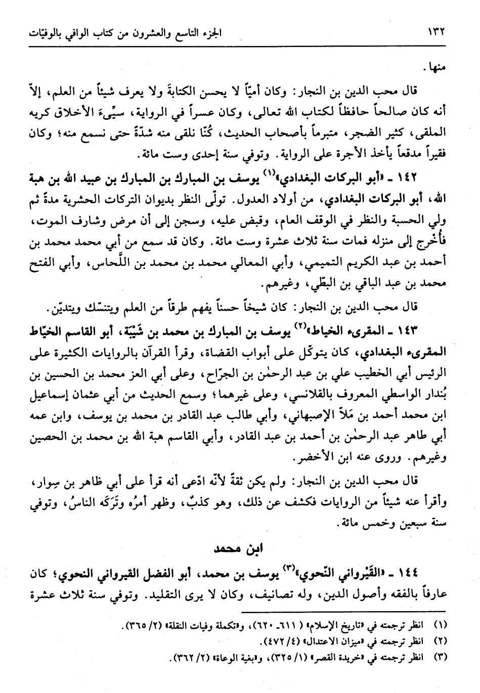 144 - القيرواني النَّحْوِيّ يُوسُف بن مُحَمَّد أَبُو الْفضل القيرواني النَّحْوِيّ كَانَ عَارِفًا بالفقه وأصول الدّين وَله تصانيف وَكَانَ لَا يرى التَّقْلِيد وَتُوفِّي سنة ثَلَاث عشرَة