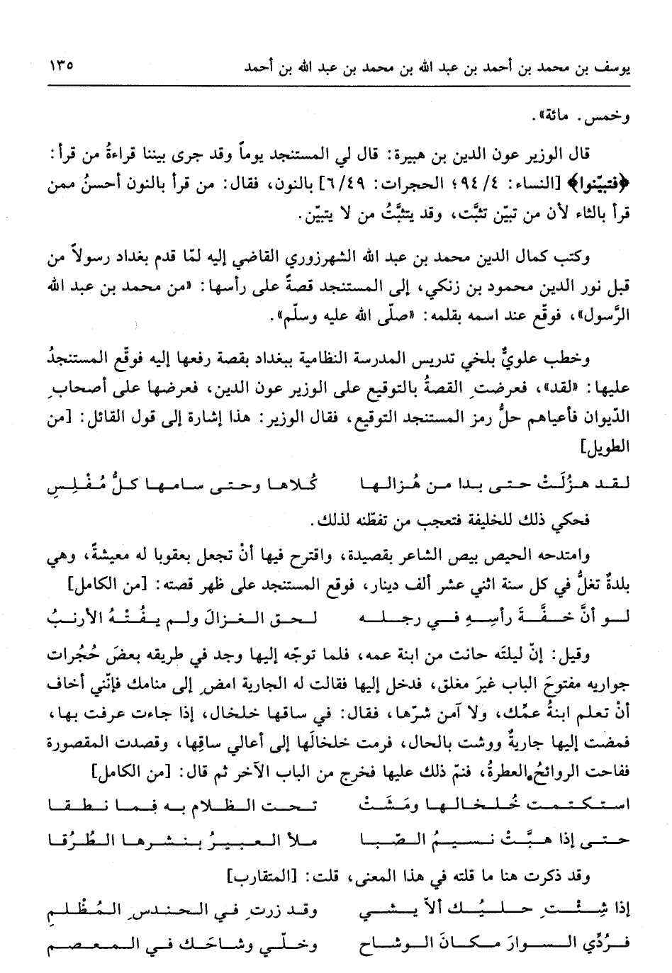 قَالَ الْوَزير عون الدّين بن هُبَيْرَة قَالَ لي المستنجد يَوْمًا وَقد جرى بَيْننَا قِرَاءَة من قَرَأَ {فَتَبَيَّنُوا} النِّسَاء 4 / 94 الحجرات 49 / 6 بالنُّون فَقَالَ من قَرَأَ بالنُّون أحسن مِمَّن قَرَأَ بالثاء لِأَن من تبين تثبت وَقد يتثبت من لَا يتَبَيَّن