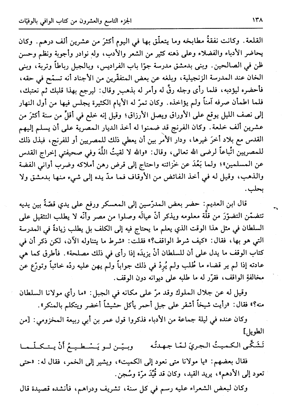 قَالَ ابْن العديم حضر بعض المدرسين إِلَى المعسكر وَرفع على يَدي قصَّة بَين يَدَيْهِ تَتَضَمَّن التضور من قلَّة معلومه وَيذكر أَن عِيَاله وصلوا من مصر وَأَنه لَا يطْلب التثقيل على السُّلْطَان فِي مثل هَذَا الْوَقْت الَّذِي يعلم مَا يحْتَاج فِيهِ إِلَى الكلف بل يطْلب زِيَادَة فِي الْمدرسَة الَّتِي هُوَ بهَا فَقَالَ كَيفَ شَرط الْوَاقِف فَقلت شَرط مَا يتَنَاوَلهُ الْآن لَكِن ذكر أَن فِي كتاب الْوَقْف مَا يدل على أَن للسُّلْطَان أَن يزِيدهُ إِذا رأى فِي ذَلِك مصلحَة فَأَطْرَقَ كَمَا هِيَ عَادَته إِذا لم ير قَضَاء مَا طلب وَلم يرد فِي ذَلِك جَوَابا وَلم يهن عَلَيْهِ رده خائبا وتورع عَن مُخَالفَة الْوَاقِف فقرر لَهُ مَا طلبه على ديوانه دون الْوَقْف