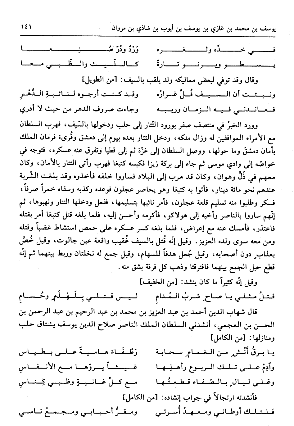 قَالَ شهَاب الدّين أَحْمد بن عبد الْعَزِيز بن مُحَمَّد بن عبد الرَّحِيم بن عبد الرَّحْمَن بن الْحسن بن العجمي أَنْشدني السُّلْطَان الْملك النَّاصِر صَلَاح الدّين يُوسُف يشتاق حلب ومنازلها // (من الْكَامِل) //