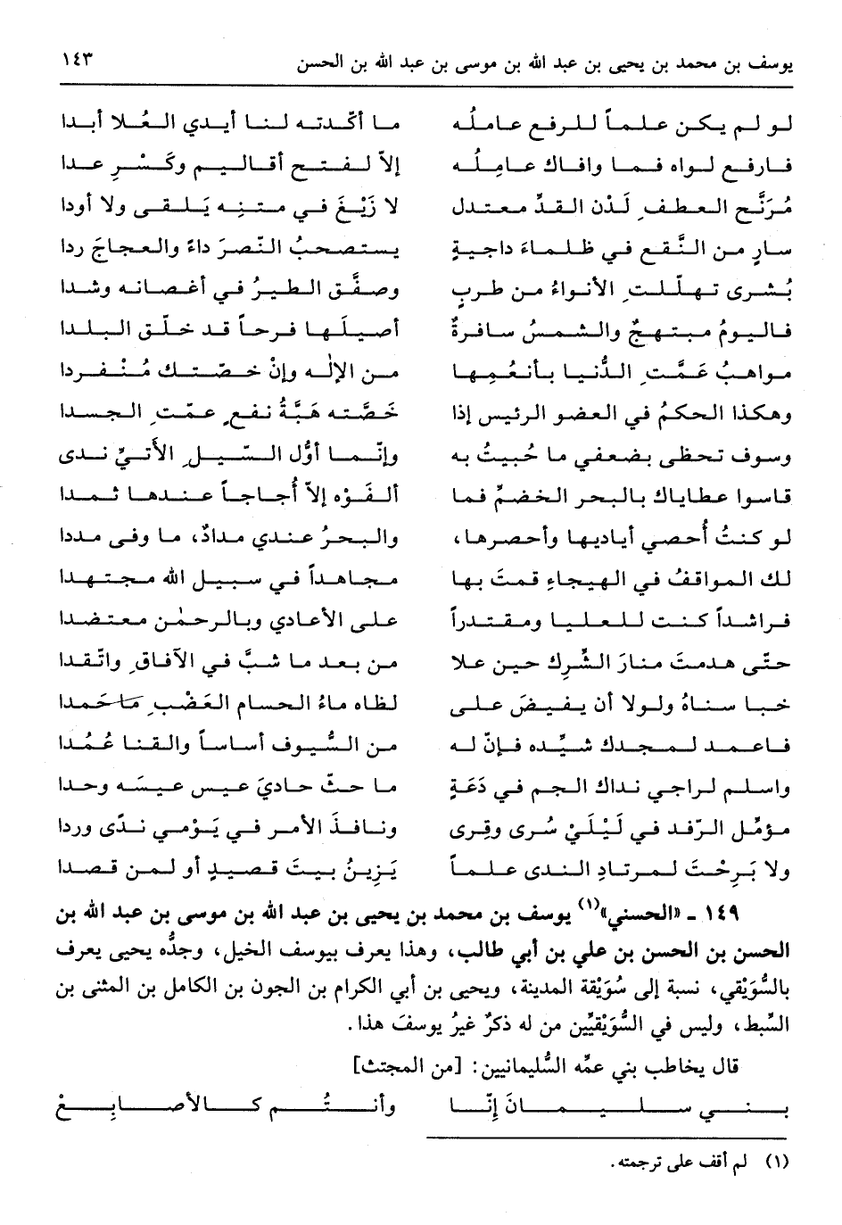 149 - الحسني يُوسُف بن مُحَمَّد بن يحيى بن عبد الله بن مُوسَى بن عبد الله بن الْحسن بن الْحسن بن عَليّ بن أبي طَالب وَهَذَا يعرف بِيُوسُف الْخَيل وجده يحيى يعرف بالسويقي نِسْبَة إِلَى سويقة الْمَدِينَة وَيحيى بن أبي الْكِرَام بن الجون بن الْكَامِل بن الْمثنى بن السبط وَلَيْسَ فِي السويقيين من لَهُ ذكر غير يُوسُف هَذَا