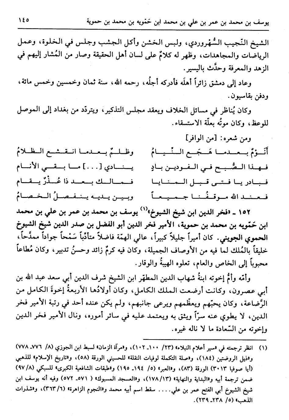 152 - فَخر الدّين ابْن شيخ الشُّيُوخ يُوسُف بن مُحَمَّد بن عمر بن عَليّ بن مُحَمَّد ابْن حمويه بن مُحَمَّد بن حموية الْأَمِير فَخر الدّين أَبُو الْفضل بن صدر الدّين شيخ الشُّيُوخ الْحَمَوِيّ الْجُوَيْنِيّ كَانَ أَمِيرا جَلِيلًا كَبِيرا عالي الهمة فَاضلا متأدبا سَمحا جوادا ممدحا خليقا بِالْملكِ لما فِيهِ من الْأَوْصَاف الجميلة وَكَانَ فِيهِ كرم زَائِد وَحسن تَدْبِير وَكَانَ مُطَاعًا محبوبا إِلَى الْخَاص وَالْعَام تعلوه الهيبة وَالْوَقار