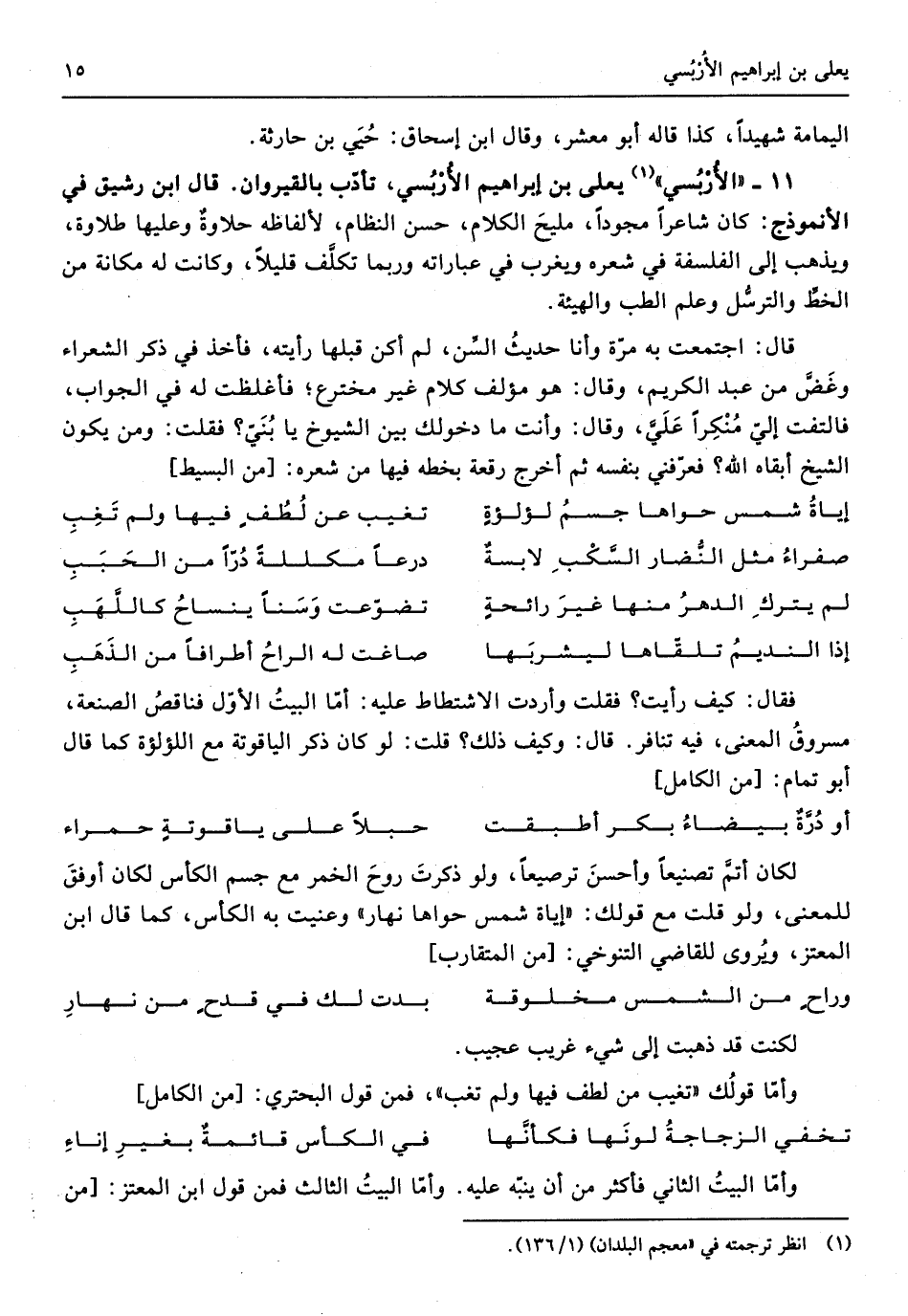11 - الأربسي يعلى بن إِبْرَاهِيم الأربسي تأدب بالقيروان قَالَ ابْن رَشِيق فِي الأنموذج كَانَ شَاعِرًا مجودا مليح الْكَلَام حسن النظام لألفاظه حلاوة وَعَلَيْهَا طلاوة وَيذْهب إِلَى الفلسفة فِي شعره ويغرب فِي عباراته وَرُبمَا تكلّف قَلِيلا وَكَانَت لَهُ مكانة من الْخط والترسل وَعلم الطِّبّ والهيئة