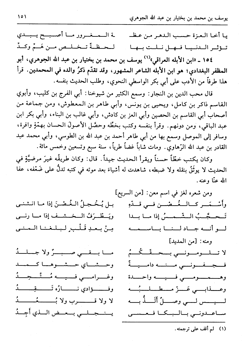 154 - ابْن الأبلة الْعِرَاقِيّ يُوسُف بن مُحَمَّد بن بختيار بن عبد الله الْجَوْهَرِي أَبُو المظفر الْبَغْدَادِيّ هُوَ ابْن الأبله الشَّاعِر الْمَشْهُور وَقد تقدم ذكر وَالِده فِي المحمدين قَرَأَ هَذَا طرفا من الْأَدَب على أبي بكر الوَاسِطِيّ النَّحْوِيّ وَطلب الحَدِيث بِنَفسِهِ