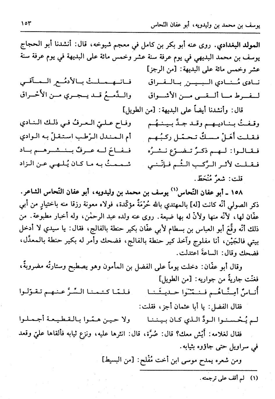 158 - أَبُو عَفَّان النّحاس يُوسُف بن مُحَمَّد بن وليدويه أَبُو عَفَّان النّحاس الشَّاعِر ذكر الصولي أَنه كَانَت لَهُ بالمهتدي بِاللَّه حُرْمَة مُؤَكدَة فولاه مَعُونَة رزقا مِنْهُ بِاخْتِيَار من أبي عَفَّان لَهَا لِأَنَّهُ مِنْهَا وَلِأَن لَهُ بهَا ضَيْعَة روى عَنهُ وَلَده عبد الرَّحْمَن وَله أَخْبَار مطبوعة من ذَلِك أَنه وَقع أَبُو الْعَبَّاس بن بسطَام لأبي عَفَّان بكير حِنْطَة بالفالج فَقَالَ يَا سَيِّدي لَا أَدخل بَيْتِي فالجين أَنا مفلوج وآخذ كير حِنْطَة بالفالج فَضَحِك وَأمر لَهُ بكير حِنْطَة بالمعدل فَضَحِك وَقَالَ السَّاعَة اعتدلت