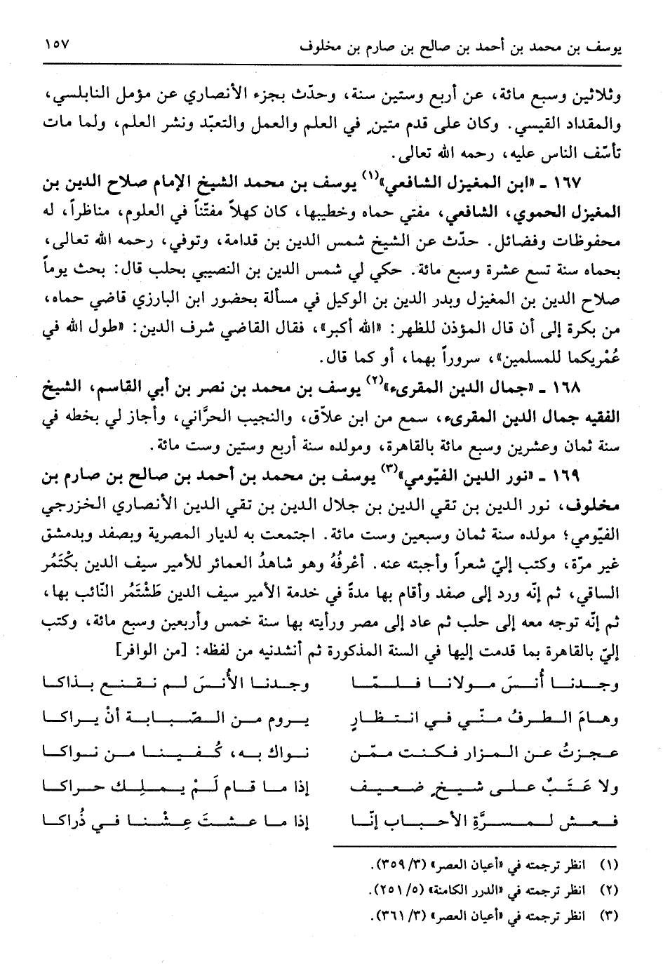 169 - نور الدّين الفيومي يُوسُف بن مُحَمَّد بن أَحْمد بن صَالح بن صارم بن مخلوف نور الدّين بن تَقِيّ الدّين بن جلال الدّين بن تفي الدّين الْأنْصَارِيّ الخزرجي الفيومي مولده سنة ثَمَان وَسبعين وست مائَة اجْتمعت بِهِ لديار المصرية وبصفد وبدمشق غير مرّة وَكتب إِلَى شعرًا وأجبته عَنهُ أعرفهُ وَهُوَ شَاهد العمائر للأمير سيف الدّين بكتمر الساقي ثمَّ إِنَّه ورد إِلَى صفد وَأقَام بهَا مُدَّة فِي خدمَة الْأَمِير سيف الدّين طشتمر النَّائِب بهَا ثمَّ إِنَّه توجه مَعَه إِلَى حلب ثمَّ عَاد إِلَى مصر ورأيته بهَا سنة خمس وَأَرْبَعين وَسبع مائَة وَكتب إِلَيّ بِالْقَاهِرَةِ بِمَا قدمت إِلَيْهَا فِي السّنة الْمَذْكُورَة ثمَّ أنشدنيه من لَفظه // (من الوافر) //