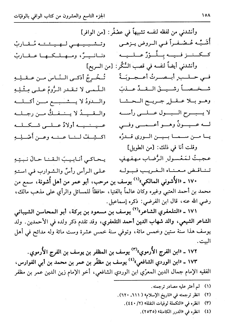 171 - التلعفري الشَّاعِر يُوسُف بن مَسْعُود بن بركَة أَبُو المحاسن الشَّيْبَانِيّ الشَّاعِر الشيعي وَالِد شهَاب الدّين أَحْمد التلعفري وَقد تقدم ذكر وَلَده فِي الأحمدين ولد يُوسُف هَذَا سنة سِتِّينَ وَخمْس مائَة وَتُوفِّي سنة خمس عشرَة وست مائَة وَله مدائح فِي أهل الْبَيْت