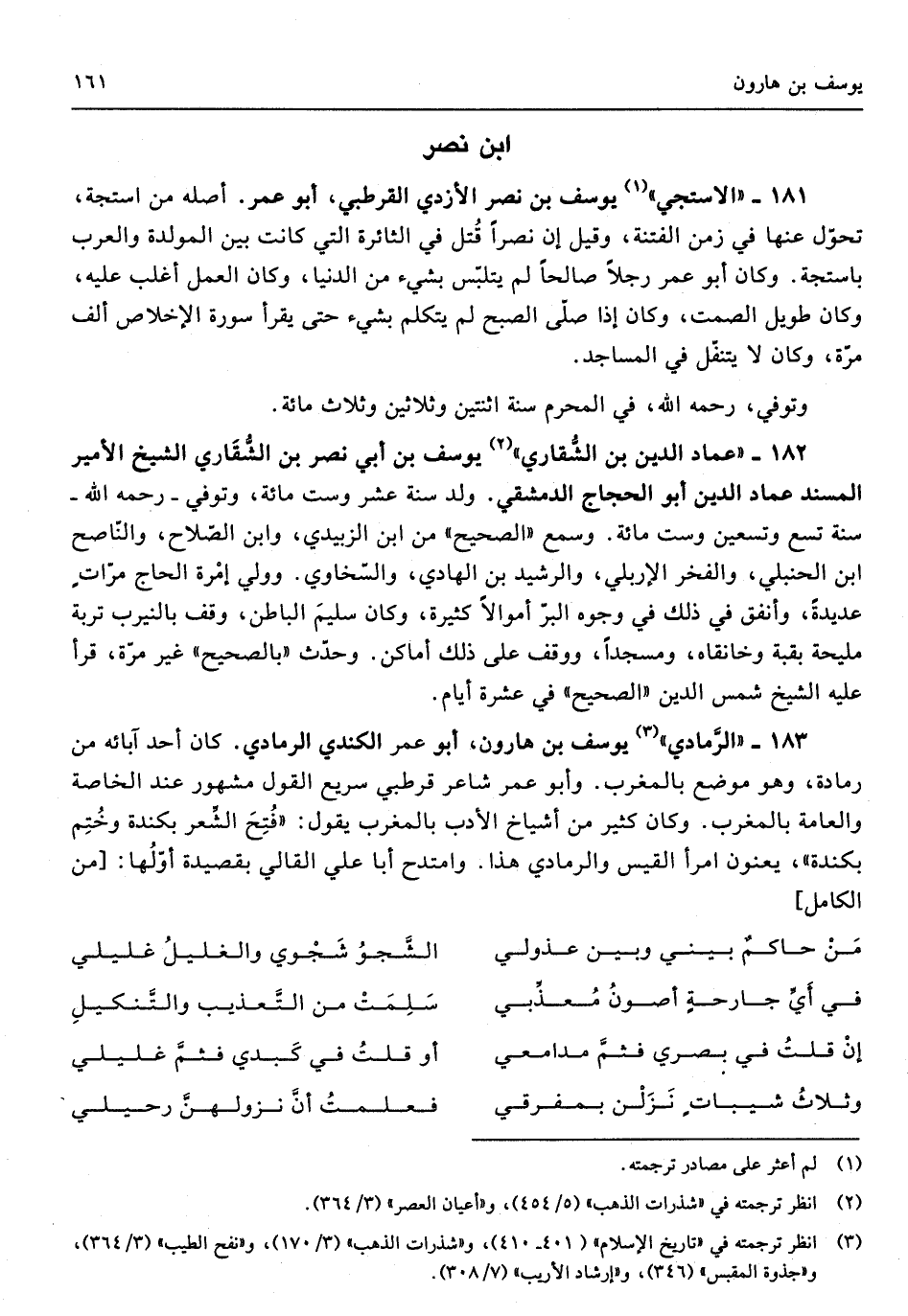 181 - الاستجي يُوسُف بن نصر الْأَزْدِيّ الْقُرْطُبِيّ أَبُو عمر أَصله من استجة تحول عَنْهَا فِي زمن الْفِتْنَة وَقيل إِن نصرا قتل فِي الثائرة الَّتِي كَانَت بَين المولدة وَالْعرب باستجة وَكَانَ أَبُو عمر رجلا صَالحا لم يتلبس بِشَيْء من الدُّنْيَا وَكَانَ الْعَمَل أغلب عَلَيْهِ وَكَانَ طَوِيل الصمت وَكَانَ إِذا صلى الصُّبْح لم يتَكَلَّم بِشَيْء حَتَّى يقْرَأ سُورَة الْإِخْلَاص ألف مرّة وَكَانَ لَا يتَنَفَّل فِي الْمَسَاجِد