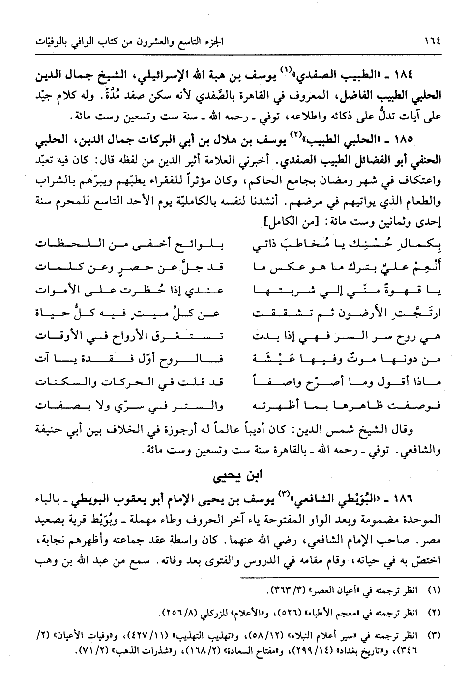 186 - الْبُوَيْطِيّ الشَّافِعِي يُوسُف بن يحيى الإِمَام أَبُو يَعْقُوب الْبُوَيْطِيّ بِالْيَاءِ الْمُوَحدَة مَضْمُومَة وَبعد الْوَاو الْمَفْتُوحَة يَاء آخر الْحُرُوف وطاء مُهْملَة وبويط قَرْيَة بصعيد مصر صَاحب الإِمَام الشَّافِعِي رَضِي الله عَنْهُمَا كَانَ وَاسِطَة عقد جماعته وأظهرهم نجابة اخْتصَّ بِهِ فِي حَيَاته وَقَامَ مقَامه فِي الدُّرُوس وَالْفَتْوَى بعد وَفَاته سمع من عبد الله بن وهب