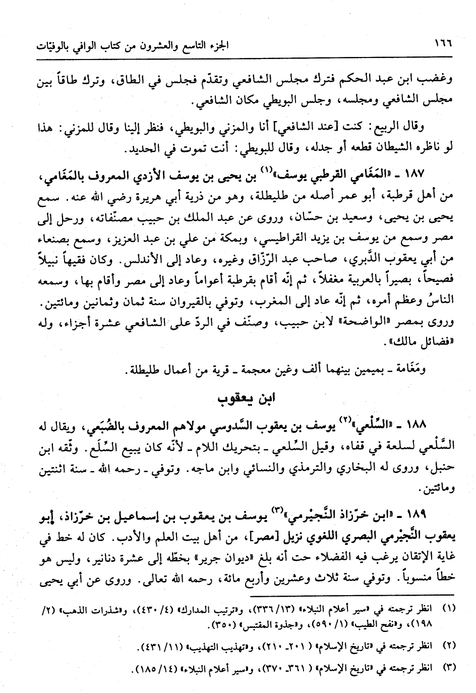 188 - السلعي يُوسُف بن يَعْقُوب السدُوسِي مَوْلَاهُم الْمَعْرُوف بالضبعي وَيُقَال لَهُ السلعي لسلعة فِي قَفاهُ وَقيل السلعي بتحريك اللَّام لِأَنَّهُ كَانَ يَبِيع السّلع وَثَّقَهُ ابْن حَنْبَل وروى لَهُ البُخَارِيّ والتِّرمذي والنَّسائي وَابْن ماجة وَتُوفِّي رَحمَه الله سنة اثْنَتَيْنِ وَمِائَتَيْنِ