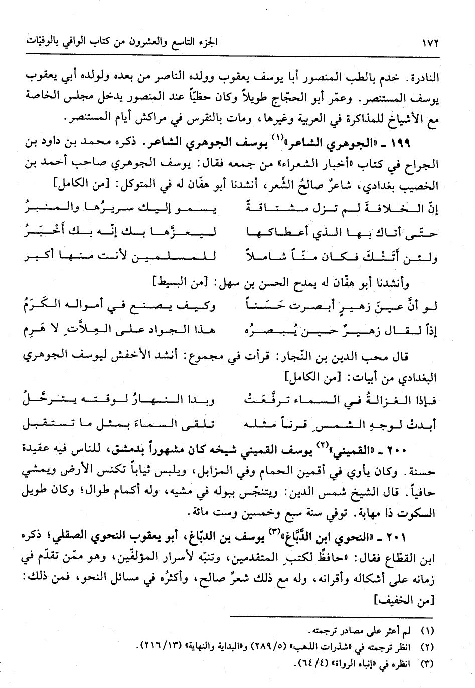 199 - الْجَوْهَرِي الشَّاعِر يُوسُف الْجَوْهَرِي الشَّاعِر ذكره مُحَمَّد بن دَاوُد بن الْجراح فِي كتاب أَخْبَار الشُّعَرَاء من جمعه فَقَالَ يُوسُف الْجَوْهَرِي صَاحب أحم بن الخصيب بغدادي شَاعِر صَالح الشّعْر أنشدنا أَبُو هفان لَهُ فِي المتَوَكل // (من الْكَامِل) //