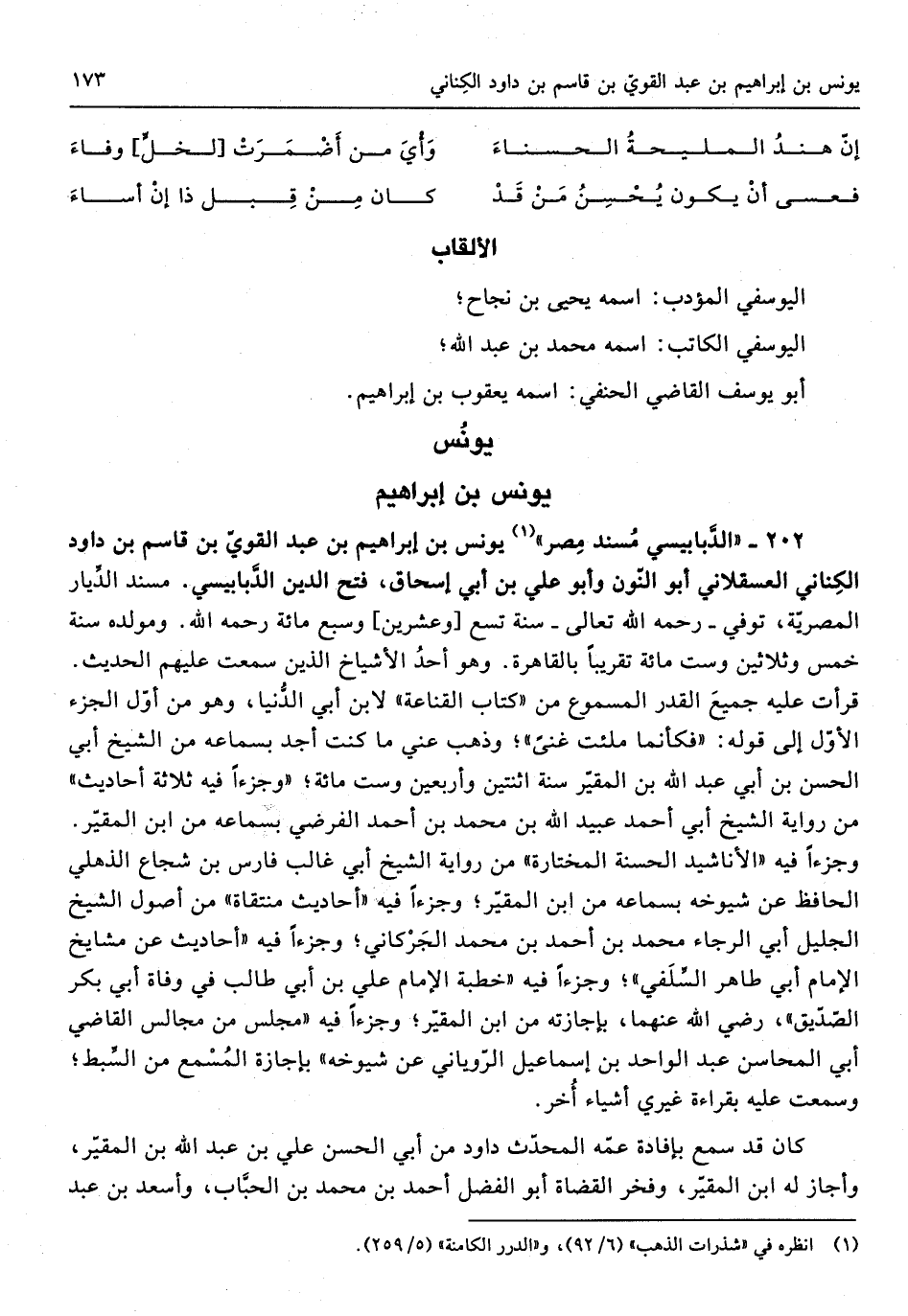 202 - الدبابيسي مُسْند مصر يُونُس بن إِبْرَاهِيم بن عبد الْقوي بن قَاسم بن دَاوُد الْكِنَانِي الْعَسْقَلَانِي أَبُو النُّون وَأَبُو عَليّ بن أبي إِسْحَاق فتح الدّين الدبابيسي مُسْند الديار المصرية توفّي رَحمَه الله تَعَالَى سنة تسع وَعشْرين وَسبع مائَة رَحمَه الله ومولده سنة خمس وَثَلَاثِينَ وست مائَة تَقْرِيبًا بِالْقَاهِرَةِ وَهُوَ أحد الْأَشْيَاخ الَّذين سَمِعت عَلَيْهِم الحَدِيث قَرَأت عَلَيْهِ جَمِيع الْقدر المسمون من كتاب القناعة لِابْنِ أبي الدُّنْيَا وَهُوَ من أول الْجُزْء الأول إِلَى قَوْله فَكَأَنَّمَا ملئت غنى وَذهب عني مَا كنت أجد بِسَمَاعِهِ من الشَّيْخ أبي الْحسن بن أبي عبد الله بن المقير سنة اثْنَتَيْنِ وَأَرْبَعين وست مائَة وجزءا فِيهِ ثَلَاثَة أَحَادِيث من رِوَايَة الشَّيْخ أبي أَحْمد عُبيد الله بن مُحَمَّد بن أَحْمد الفَرَضي بِسَمَاعِهِ من ابْن المقير وجزءا فِيهِ الأناشيد الْحَسَنَة المختارة من رِوَايَة الشَّيْخ أبي غَالب فَارس بن شُجَاع الذهلي الْحَافِظ عَن شُيُوخه بِسَمَاعِهِ من ابْن المقير وجزءا فِيهِ أَحَادِيث منتقاة من أصُول الشَّيْخ الْجَلِيل أبي الرَّجَاء مُحَمَّد بن أَحْمد بن مُحَمَّد الجركاني وجزءا فِيهِ أَحَادِيث عَن مَشَايِخ الإِمَام أبي طَاهِر السلَفِي وجزءا فِيهِ خطبه الإِمَام عَليّ بن أبي طَالب فِي وَفَاة أبي بكر الصّديق رَضِي الله عَنْهُمَا بإجازته من ابْن المقير وجزءا فِيهِ مجْلِس من مجَالِس القَاضِي أبي المحاسن عبد الْوَاحِد بن إِسْمَاعِيل الرَّوْيَانِيّ عَن شُيُوخه بِإِجَازَة المسمع من السبط وَسمعت عَلَيْهِ بِقِرَاءَة غَيْرِي أَشْيَاء أخر