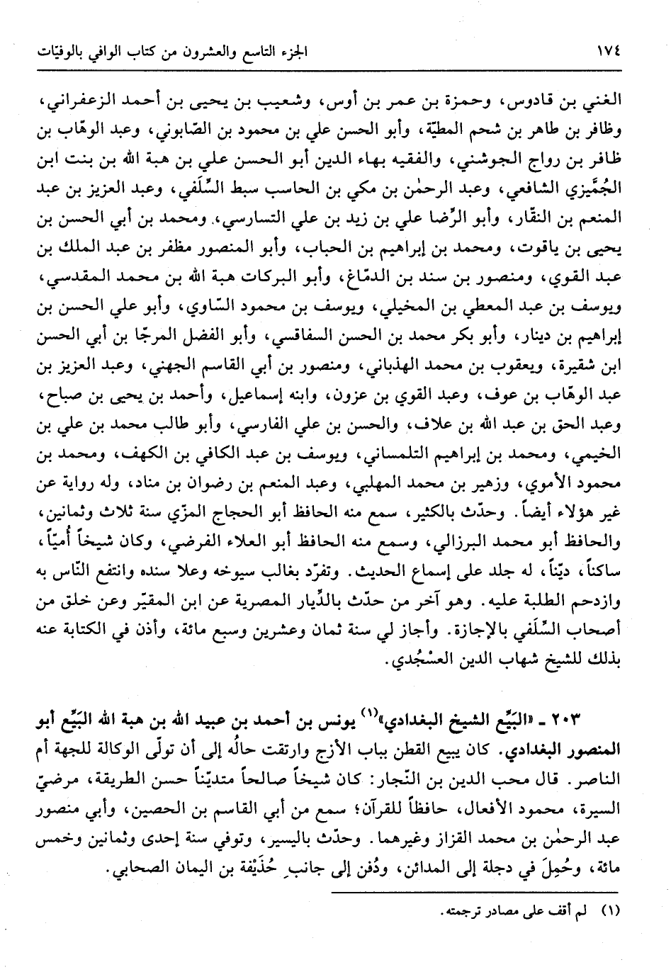 203 - البيع الشَّيْخ الْبَغْدَادِيّ يُونُس بن أَحْمد بن عبيد الله بن هبة الله البيع أَبُو الْمَنْصُور الْبَغْدَادِيّ كَانَ يَبِيع الْقطن بِبَاب الأزج وارتقت حَاله إِلَى أَن تولى الْوكَالَة للجهة أم النَّاصِر قَالَ محب الدّين بن النجار كَانَ شَيخا صَالحا متدينا حسن الطَّرِيقَة مرضِي السِّيرَة مَحْمُود الْأَفْعَال حَافِظًا لِلْقُرْآنِ سمع من أبي الْقَاسِم بن الْحصين وَأبي مَنْصُور عبد الرَّحْمَن بن مُحَمَّد الْقَزاز وَغَيرهمَا وَحدث باليسير وَتُوفِّي سنة إِحْدَى وَثَمَانِينَ وَخمْس مائَة وَحمل فِي دجلة إِلَى الْمَدَائِن وَدفن إِلَى جَانب حُذَيْفَة بن الْيَمَان الصَّحَابِيّ