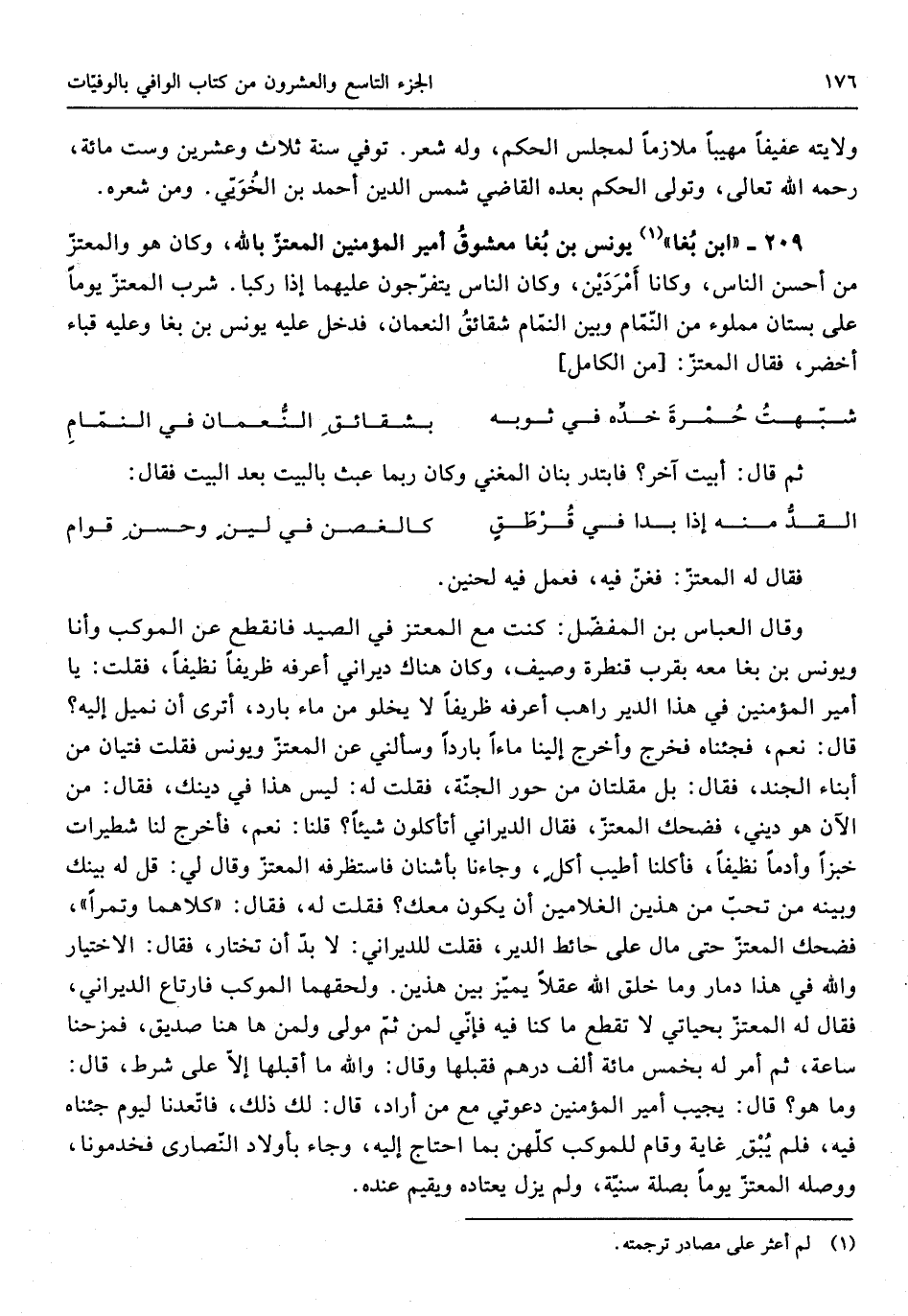 209 - ابْن بغا يُونُس بن بتغا معشوق أَمِير الْمُؤمنِينَ المعتز بِاللَّه وَكَانَ هُوَ والمعتز من أحسن النَّاس وَكَانَا أمردين وَكَانَ النَّاس يتفرجون عَلَيْهِمَا إِذا ركبا شرب المعتز يَوْمًا على بُسْتَان مَمْلُوء من النمام وَبَين النمام شقائق النُّعْمَان فَدخل عَلَيْهِ يُونُس بن بغا وَعَلِيهِ قبَاء أَخْضَر فَقَالَ المعتز // (من الْكَامِل) //