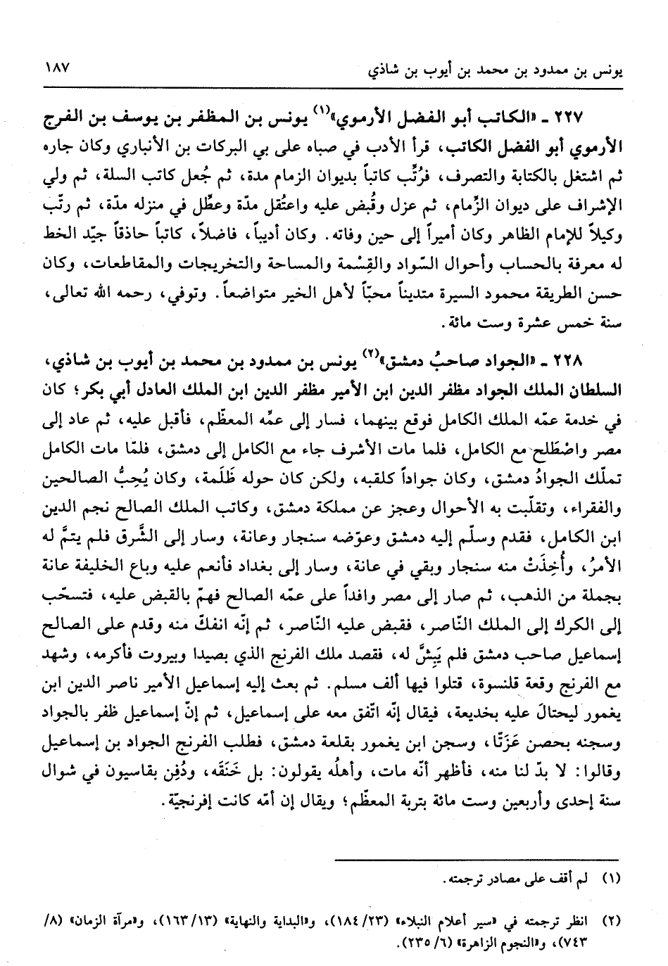 227 - الْكَاتِب أَبُو الْفضل الأرموي يُونُس بن المظفر بن يُوسُف بن الْفرج الأرموي أَبُو الْفضل الْكَاتِب قَرَأَ الْأَدَب فِي صباه على أبي البركات بن الْأَنْبَارِي وَكَانَ جَاره ثمَّ اشْتغل بِالْكِتَابَةِ وَالتَّصَرُّف فرتب كَاتبا بديوان الزِّمَام مُدَّة ثمَّ جعل كَاتب السلَّة ثمَّ ولي الإشراف على ديوَان الزِّمَام ثمَّ عزل وَقبض عَلَيْهِ واعتقل مُدَّة وعطل فِي منزله مُدَّة ثمَّ رتب وَكيلا للْإِمَام الظَّاهِر وَكَانَ أَمِيرا إِلَى حِين وَفَاته وَكَانَ أديبا فَاضلا كَاتبا حاذقا جيد الْخط لَهُ معرفَة بِالْحِسَابِ وأحوال السوَاد وَالْقِسْمَة والمساحة والتخريجات والمقاطعات وَكَانَ حسن الطَّرِيقَة مَحْمُود السِّيرَة متدينا محبا لأهل الْخَيْر متواضعا وَتُوفِّي رَحمَه الله تَعَالَى سنة خمس عشرَة وست مائَة