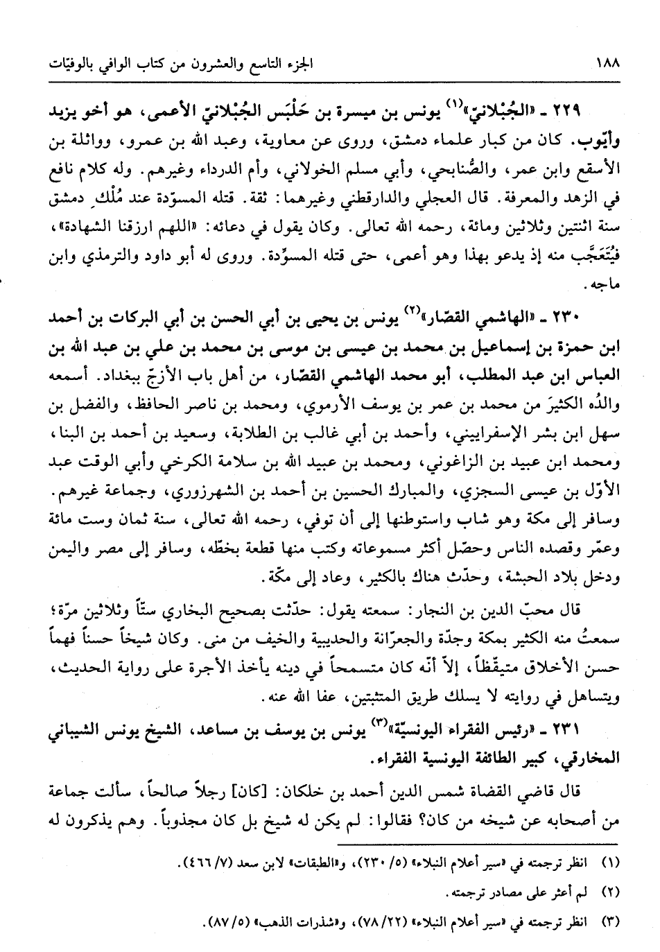 229 - الجبلاني يُونُس بن ميسرَة بن حَلبس الجبلاني الْأَعْمَى هُوَ أَخُو يزِيد وَأَيوب كَانَ من كبار عُلَمَاء دمشق وروى عَن مُعَاوِيَة وَعبد الله بن عَمْرو وواثلة بن الْأَسْقَع وَابْن عمر والصنابحي وَأبي مُسلم الْخَولَانِيّ وَأم الدَّرْدَاء وَغَيرهم وَله كَلَام نَافِع فِي الزّهْد والمعرفة قَالَ الْعجلِيّ وَالدَّارَقُطْنِيّ وَغَيرهمَا ثِقَة قَتله المسودة عِنْد ملك دمشق سنة اثْنَتَيْنِ وَثَلَاثِينَ وَمِائَة رَحمَه الله تَعَالَى وَكَانَ يَقُول فِي دُعَائِهِ اللَّهُمَّ ارزقنا الشَّهَادَة فيتعجب مِنْهُ إِذْ يَدْعُو بِهَذَا وَهُوَ أعمى حَتَّى قَتله المسودة وروى لَهُ ابو دَاوُد وَالتِّرْمِذِيّ وَابْن ماجة