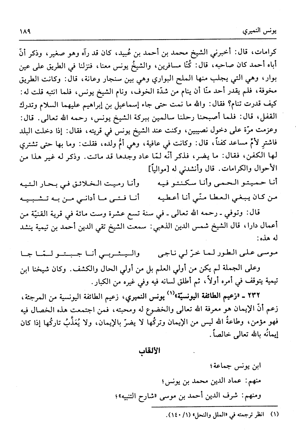 232 - زعيم الطَّائِفَة اليونسية يُونُس النميري زعيم الطَّائِفَة اليونسية من المرجئة زعم أَن الْإِيمَان هُوَ معرفَة الله تَعَالَى والخضوع لَهُ ومحبته فَمن اجْتمعت هَذِه الْخِصَال فِيهِ فَهُوَ مُؤمن وَطَاعَة الله لَيْسَ من الْإِيمَان وَتركهَا لَا يضر بِالْإِيمَان وَلَا يعذب تاركها إِذا كَانَ إيمَانه بِاللَّه تَعَالَى خَالِصا