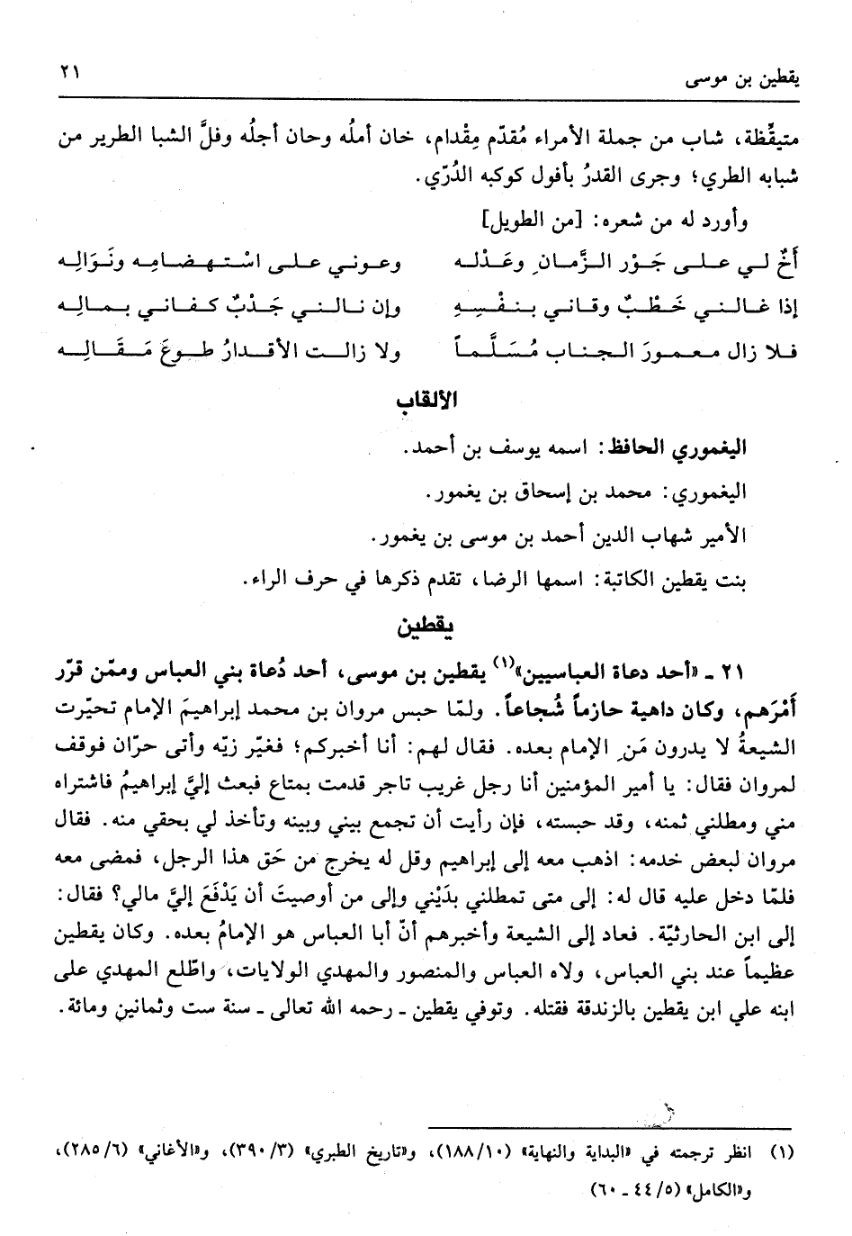 21 - أحد دعاة العباسيين يَقْطِين بن مُوسَى أحد دعاة بني الْعَبَّاس وَمِمَّنْ قرر أَمرهم وَكَانَ داهية حازما شجاعا وَلما حبس مَرْوَان بن مُحَمَّد إِبْرَاهِيم الإِمَام تحيرت الشِّيعَة لَا يَدْرُونَ من الإِمَام بعده فَقَالَ لَهُم أَنا أخْبركُم فَغير زيه وأتى حران فَوقف لمروان فَقَالَ يَا أَمِير الْمُؤمنِينَ أَنا رجل غَرِيب تَاجر قدمت بمتاع فَبعث إِلَيّ إِبْرَاهِيم فَاشْتَرَاهُ مني ومطلني ثمنه وَقد حَبسته فَإِن رَأَيْت أَن تجمع بيني وَبَينه وَتَأْخُذ لي بحقي مِنْهُ فَقَالَ مَرْوَان لبَعض خدمه اذْهَبْ مَعَه إِلَى إِبْرَاهِيم وَقل لَهُ يخرج من حق هَذَا الرجل فَمضى مَعَه فَلَمَّا دخل عَلَيْهِ قَالَ لَهُ إِلَى مَتى تمطلني بديني وَإِلَى من أوصيت أَن يدْفع إِلَيّ مَالِي فَقَالَ إِلَى ابْن الحارثية فَعَاد إِلَى الشِّيعَة وَأخْبرهمْ أَن أَبَا الْعَبَّاس هُوَ الإِمَام بعده وَكَانَ يَقْطِين عَظِيما عِنْد بني الْعَبَّاس ولاه الْعَبَّاس والمنصور وَالْمهْدِي الولايات واطلع الْمهْدي على ابْنه عَليّ ابْن يَقْطِين بالزندقة فَقتله وَتُوفِّي يَقْطِين رَحمَه الله تَعَالَى سنة سِتّ وَثَمَانِينَ وَمِائَة