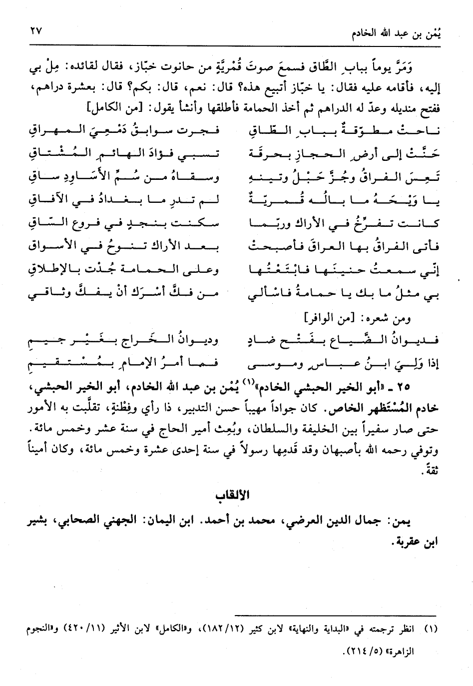 25 - أَبُو الْخَيْر الحبشي الْخَادِم يمن بن عبد الله الْخَادِم أَبُو الْخَيْر الحبشي خَادِم المستظهر الْخَاص كَانَ جوادا مهيبا حسن التَّدْبِير ذَا رَأْي وفطنة تقلبت بِهِ الْأُمُور حَتَّى صَار سفيرا بَين الْخَلِيفَة وَالسُّلْطَان وَبعث أَمِير الْحَاج فِي سنة عشر وَخمْس مائَة وَتُوفِّي رَحمَه الله بأصبهان وَقد قدمهَا رَسُولا فِي سنة إِحْدَى عشرَة وَخمْس مائَة وَكَانَ أَمينا ثِقَة