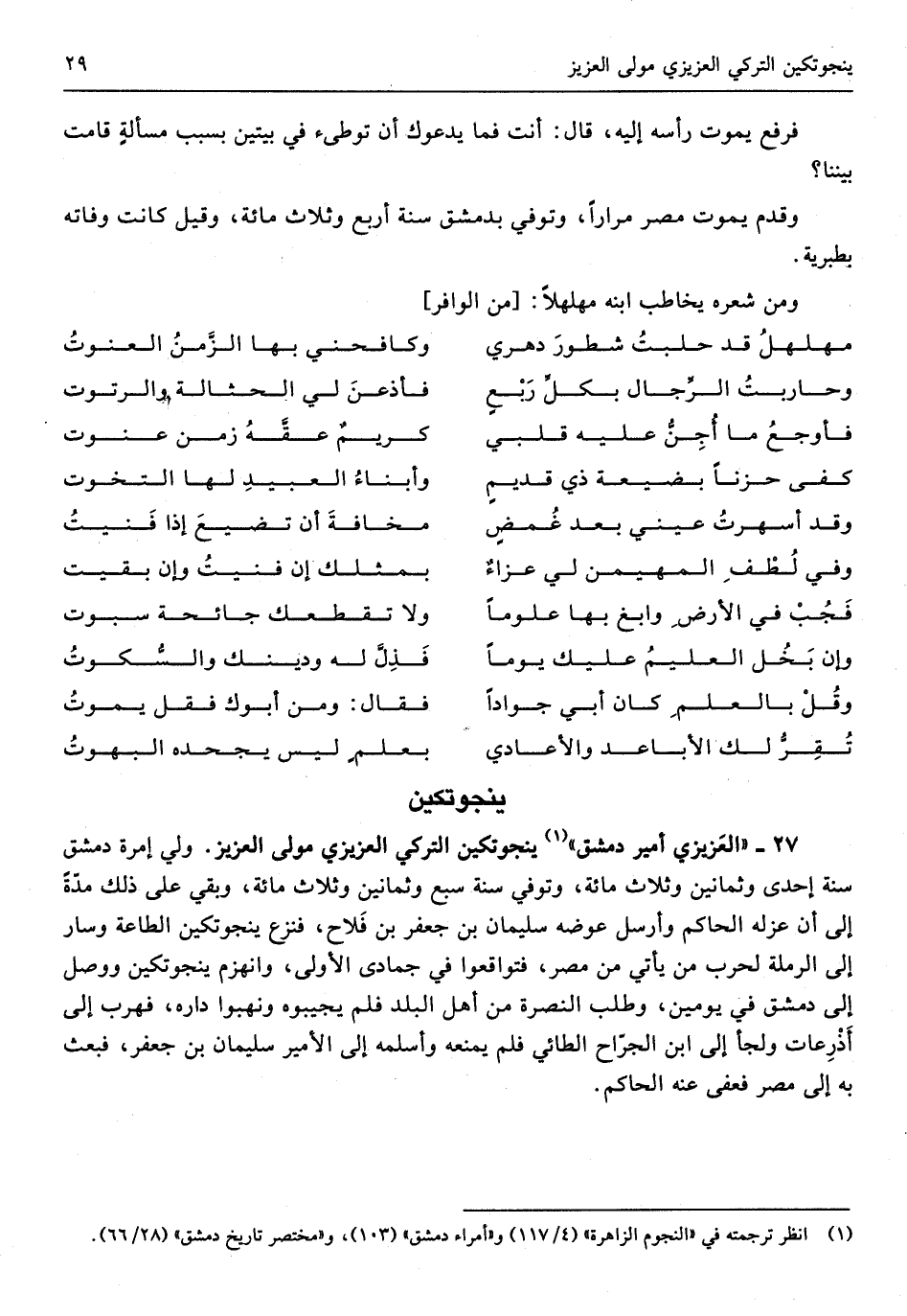 27 - العزيزي أَمِير دمشق ينجوتكين التركي العزيزي مولى الْعَزِيز ولي إمرة دمشق سنة إِحْدَى وَثَمَانِينَ وَثَلَاث مائَة وَتُوفِّي سنة سبع وَثَمَانِينَ وَثَلَاث مائَة وَبَقِي على ذَلِك مُدَّة إِلَى أَن عَزله الْحَاكِم وَأرْسل عوضه سُلَيْمَان بن جَعْفَر بن فلاح فَنزع ينجوتكين الطَّاعَة وَسَار إِلَى الرملة لِحَرْب من يَأْتِي من مصر فتواقعوا فِي جُمَادَى الأولى وَانْهَزَمَ ينجوتكين وَوصل إِلَى دمشق فِي يَوْمَيْنِ وَطلب النُّصْرَة من أهل الْبَلَد فَلم يُجِيبُوهُ ونهبوا دَاره فهرب إِلَى أَذْرُعَات ولجأ إِلَى ابْن الْجراح الطَّائِي فَلم يمنعهُ وأسلمه إِلَى الْأَمِير سُلَيْمَان بن جَعْفَر فَبعث بِهِ إِلَى مصر فعفى عَنهُ الْحَاكِم