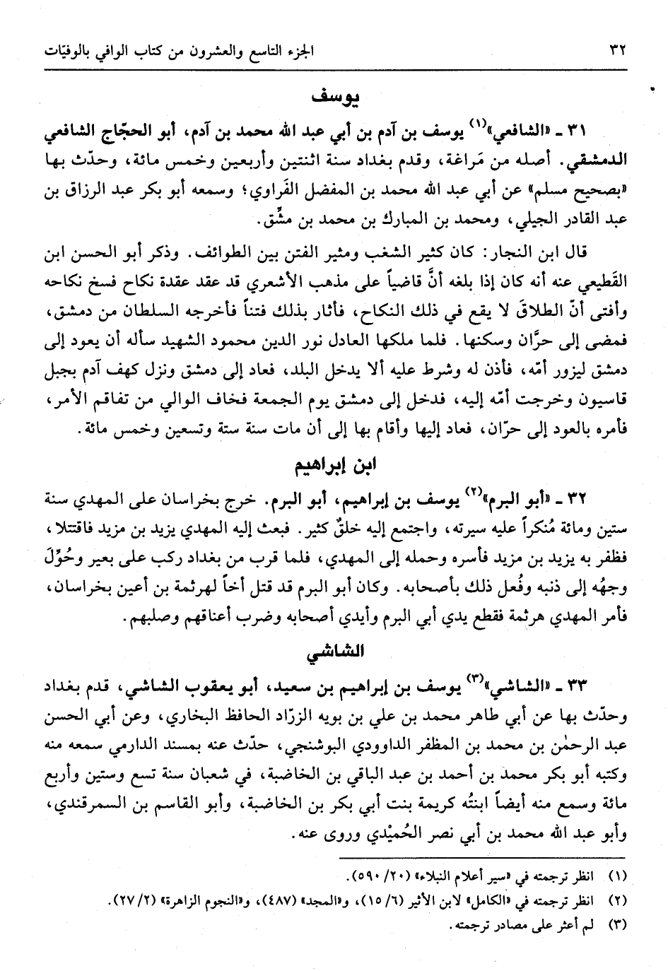 31 - الشَّافِعِي يُوسُف بن آدم بن أبي عبد الله مُحَمَّد بن آدم أَبُو الْحجَّاج الشَّافِعِي الدِّمَشْقِي أَصله من مراغة وَقدم بَغْدَاد سنة اثْنَتَيْنِ وَأَرْبَعين وَخمْس مائَة وَحدث بهَا بِصَحِيح مُسلم عَن أبي عبد الله مُحَمَّد بن الْمفضل الفراوي وسَمعه أَبُو بكر عبد الرَّزَّاق بن عبد الْقَادِر الجيلي وَمُحَمّد بن الْمُبَارك بن مُحَمَّد بن مشق