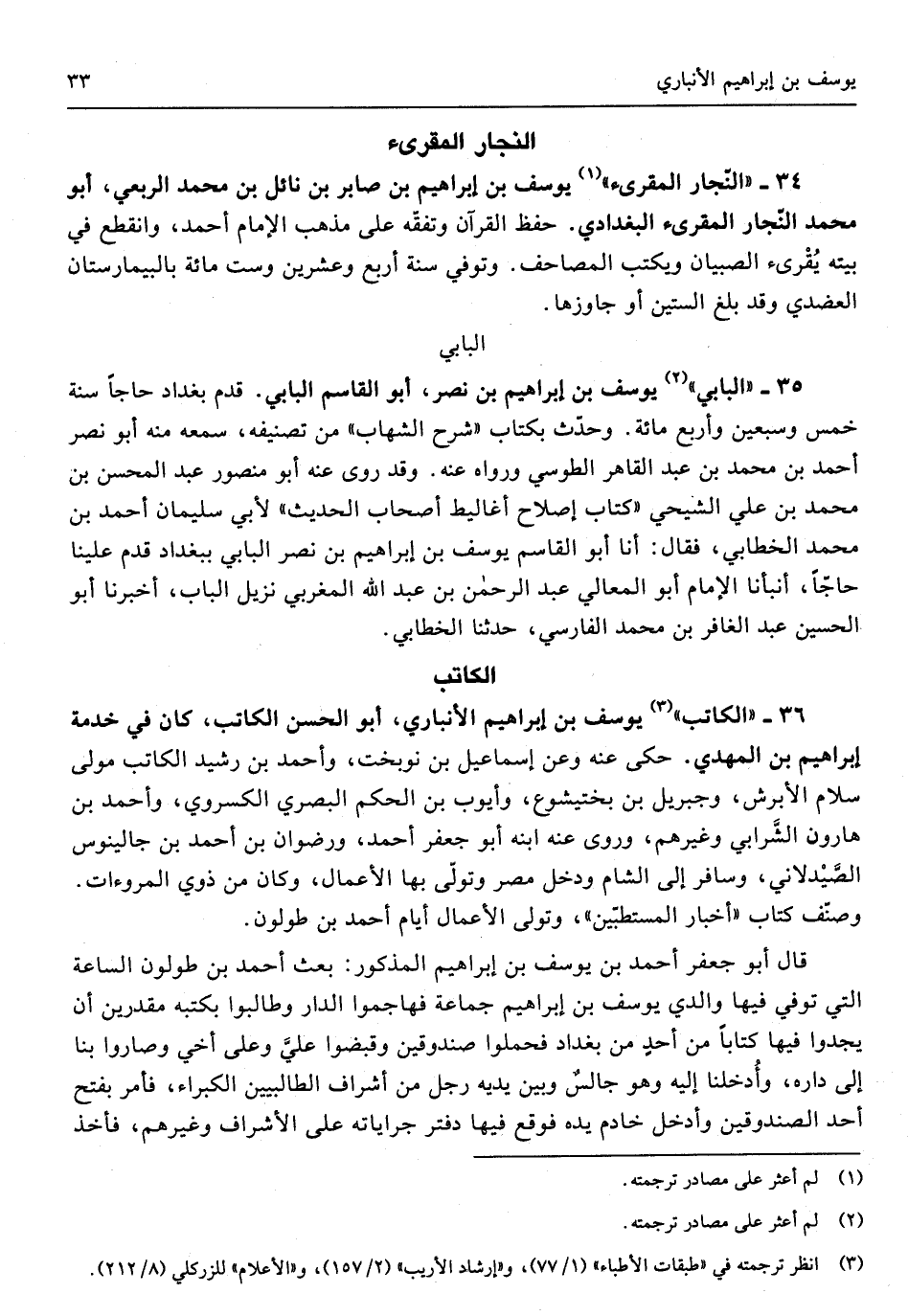 36 - الْكَاتِب يُوسُف بن إِبْرَاهِيم الْأَنْبَارِي أَبُو الْحسن الْكَاتِب كَانَ فِي خدمَة إِبْرَاهِيم بن الْمهْدي حكى عَنهُ وَعَن إِسْمَاعِيل بن نوبخت وَأحمد بن رشيد الْكَاتِب مولى سَلام الأبرش وَجِبْرِيل بن بختيشوع وَأَيوب بن الحكم الْبَصْرِيّ الكسروي وَأحمد بن هَارُون الشرابي وَغَيرهم وروى عَنهُ ابْنه أَبُو جَعْفَر أَحْمد ورضوان بن أَحْمد بن جالينوس الصيدلاني وسافر إِلَى الشَّام وَدخل مصر وَتَوَلَّى بهَا الْأَعْمَال وَكَانَ من ذَوي المروءات وصنف كتاب أَخْبَار المستطبين وَتَوَلَّى الْأَعْمَال أَيَّام أَحْمد بن طولون