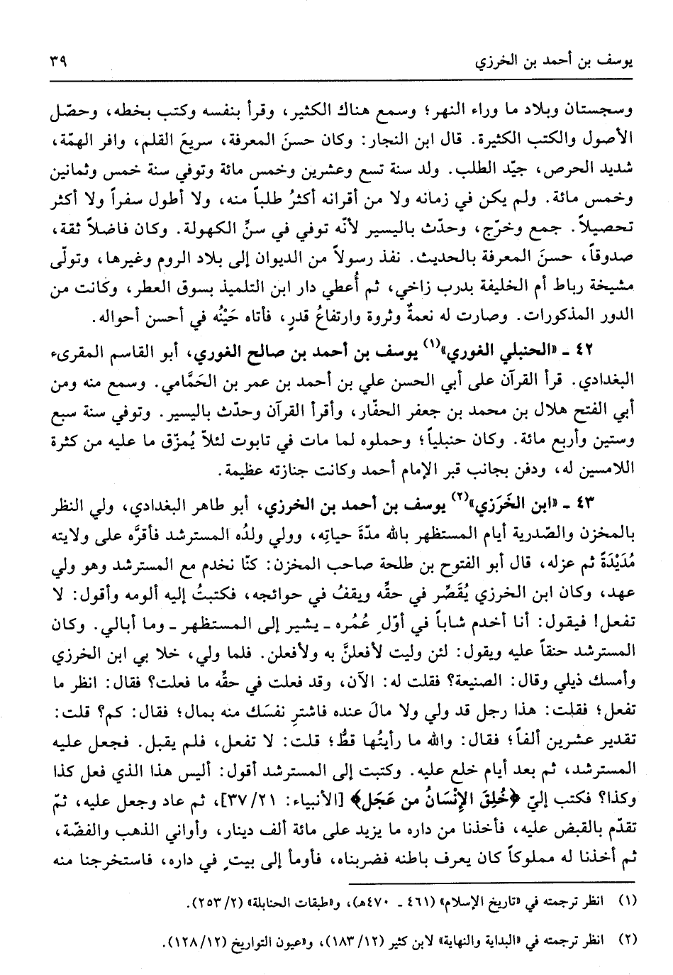 43 - ابْن الخرزي يُوسُف بن أَحْمد بن الخرزي أَبُو طَاهِر الْبَغْدَادِيّ ولي النّظر بالمخزن والصدرية أَيَّام المستظهر بِاللَّه مُدَّة حَيَاته وَولي وَلَده المسترشد فأقره على ولَايَته مديدة ثمَّ عَزله قَالَ أَبُو الْفتُوح بن طَلْحَة صَاحب المخزن كُنَّا نخدم مَعَ المسترشد وَهُوَ ولي عهد وَكَانَ ابْن الخرزي يقصر فِي حَقه وَيقف فِي حَوَائِجه فَكتبت إِلَيْهِ ألومه وَأَقُول لَا تفعل فَيَقُول أَنا أخدم شَابًّا فِي أول عمره يُشِير إِلَى المستظهر وَمَا أُبَالِي وَكَانَ المسترشد حنقا عَلَيْهِ وَيَقُول لَئِن وليت لَأَفْعَلَنَّ بِهِ وَلَأَفْعَلَن فَلَمَّا ولي خلا بِي ابْن الخرزي وَأمْسك ذيلي وَقَالَ الصنيعة فَقلت لَهُ الْآن وَقد فعلت فِي حَقه مَا فعلت فَقَالَ انْظُر مَا تفعل فَقلت هَذَا رجل قد ولي وَلَا مَال عِنْده فاشتر نَفسك مِنْهُ بِمَال فَقَالَ كم قلت تَقْدِير عشْرين ألفا فَقَالَ وَالله مَا رَأَيْتهَا قطّ قلت لَا تفعل فَلم يقبل فَجعل عَلَيْهِ المسترشد ثمَّ بعد أَيَّام خلع عَلَيْهِ وكتبت إِلَى المسترشد أَقُول أَلَيْسَ هَذَا الَّذِي فعل كَذَا وَكَذَا فَكتب إِلَيّ {خلق الْإِنْسَان من عجل} الْأَنْبِيَاء 21 / 37 ثمَّ عَاد وَجعل عَلَيْهِ ثمَّ تقدم بِالْقَبْضِ عَلَيْهِ فأخذنا من دَاره مَا يزِيد على مائَة ألف دِينَار وأواني الذَّهَب وَالْفِضَّة ثمَّ أَخذنَا لَهُ مَمْلُوكا كَانَ يعرف بَاطِنه فضربناه فَأَوْمأ إِلَى بَيت فِي دَاره فاستخرجنا مِنْهُ