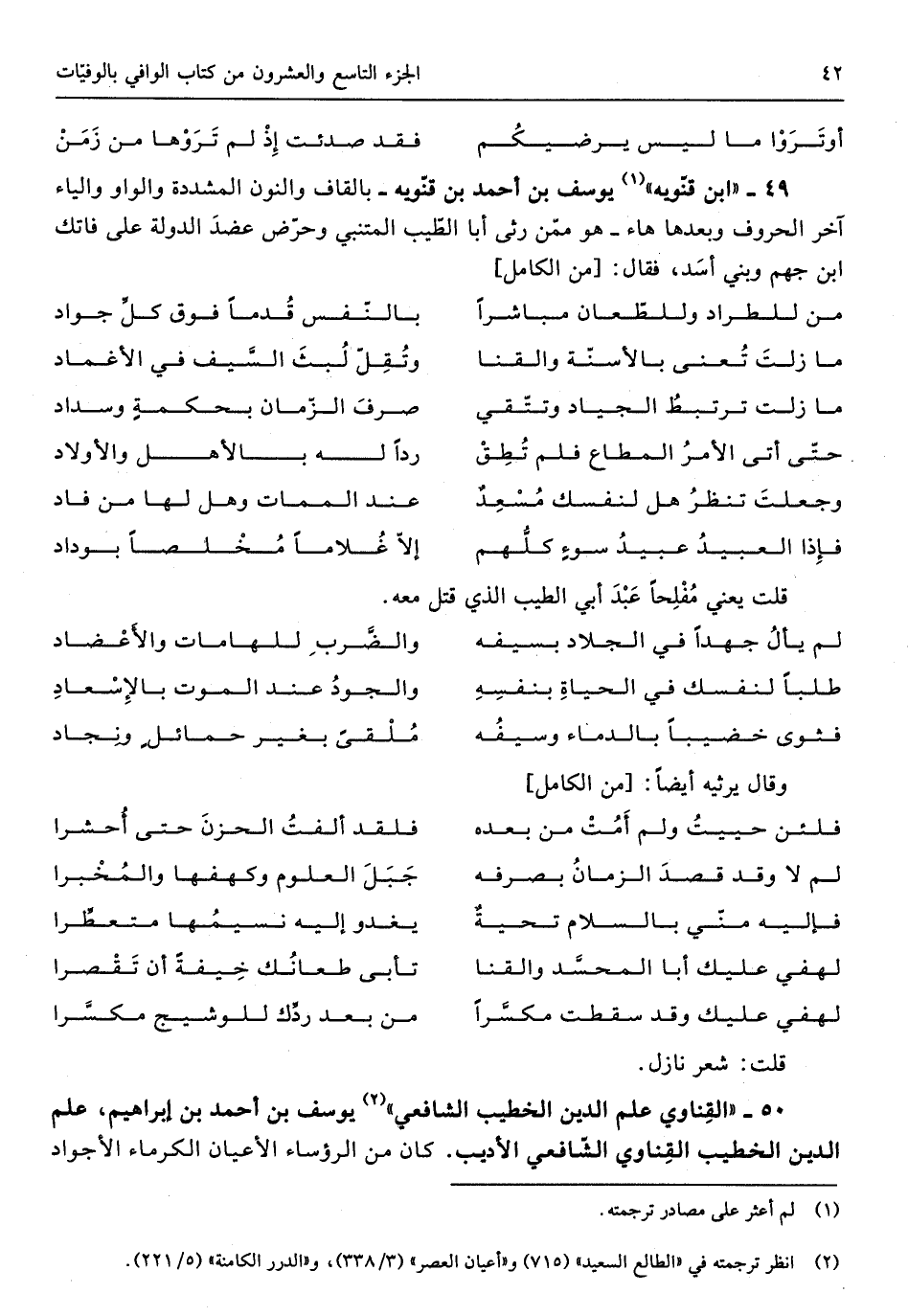 49 - ابْن قنويه يُوسُف بن أَحْمد بن قنويه بِالْقَافِ وَالنُّون الْمُشَدّدَة وَالْوَاو وَالْيَاء آخر الْحُرُوف وَبعدهَا هَاء هُوَ مِمَّن رثى أَبَا الطّيب المتنبي وحرض عضد الدولة على فاتك ابْن جهم وَبني أَسد فَقَالَ // (من الْكَامِل) //