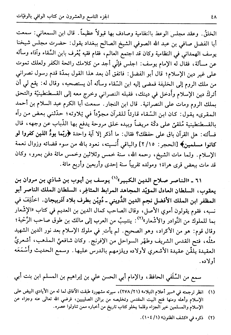 61 - النَّاصِر صَلَاح الدّين الْكَبِير يُوسُف بن أَيُّوب بن شاذي بن مَرْوَان بن يَعْقُوب السُّلْطَان الْعَادِل الْمُؤَيد الْمُجَاهِد المرابط المثاغر السُّلْطَان الْملك النَّاصِر أَبُو المظفر ابْن الْملك الْأَفْضَل نجم الدّين الدويني دوين بِطرف بِلَاد آذربيجان اخْتلف فِي نسبه فقوم يَقُولُونَ أموي الأَصْل وَقَالَ الصاحب كَمَال الدّين بن العديم فِي كتاب الْإِشْعَار بِمَا للملوك من النَّوَادِر والأشعار ينتسب من الْعَرَب إِلَى مَالك بن طوق صَاحب الرحبة وَقَالَ قوم هُوَ من الأكراد وَهُوَ الصَّحِيح لم يَأْتِ فِي مُلُوك الْإِسْلَام بعد نور الدّين الشَّهِيد مثله فتح الْقُدس الشريف وطهر السواحل من الإفرنج وَكَانَ شَافِعِيّ الْمَذْهَب أشعري العقيدة يلقن عقيدة الْأَشْعَرِيّ لأولاده ويلزمهم بالدرس عَلَيْهَا وَسمع الحَدِيث وأسمعه أَوْلَاده