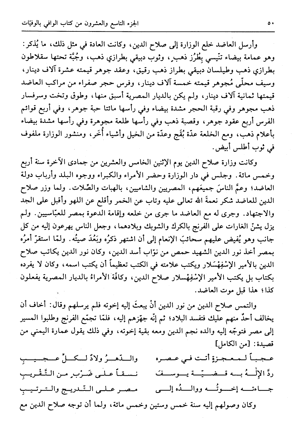 وَأرْسل العاضد خلع الوزارة إِلَى صَلَاح الدّين وَكَانَت الْعَادة فِي مثل ذَلِك مَا يذكر وَهُوَ عِمَامَة بَيْضَاء تنيسي بطرز ذهب وثوب دبيقي بطرازي ذهب وجبة تحتهَا سقلاطون بطرازي ذهب وطيلسان دبيقي بطراز ذهب رَقِيق وَعقد جَوْهَر قِيمَته عشرَة آلَاف دِينَار وَسيف محلى مجوهر قِيمَته خَمْسَة آلف دِينَار وَفرس حجر صفراء من مراكب العاضد قيمتهَا ثَمَانِيَة آلَاف دِينَار وَلم يكن بالديار المصرية اسبق مِنْهَا وطوق وتخت وسرفسار ذهب مجوهر وَفِي رَقَبَة الْحجر مشدة بَيْضَاء وَفِي رَأسهَا مِائَتَا حَبَّة جَوْهَر وَفِي أَربع قَوَائِم الْفرس أَربع عُقُود جَوْهَر وقصبة ذهب وَفِي رَأسهَا طلعة مجوهرة وَفِي رَأسهَا مشدة بَيْضَاء بأعلام ذهب وَمَعَ الخلعة عدَّة بقج وعدة من الْخَيل وَأَشْيَاء أخر ومنشور الوزارة ملفوف فِي ثوب أطلس أَبيض