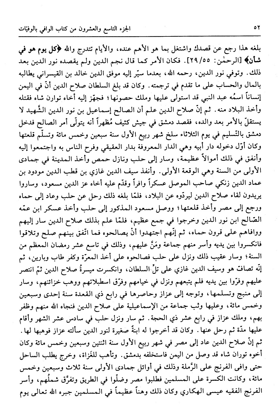 بلغه هَذَا رَجَعَ عَن قصدك واشتغل بِمَا هُوَ الأهم عِنْده وَالْأَيَّام تتدرج وَالله {كل يَوْم هُوَ فِي شَأْن} الرَّحْمَن 55 / 29 فَكَانَ الْأَمر كَمَا قَالَ نجم الدّين وَلم يَقْصِدهُ نور الدّين بعد ذَلِك وَتُوفِّي نور الدّين رَحمَه الله بَعْدَمَا سير إِلَيْهِ موفق الدّين خَالِد بن القيسراني يُطَالِبهُ بِالْمَالِ والحساب على مَا تقدم فِي تَرْجَمته وَكَانَ قد بلغ السُّلْطَان صَلَاح الدّين أَن فِي الْيمن إنْسَانا اسْمه عبد النَّبِي قد استولى عَلَيْهَا وَملك حصونها فَجهز إِلَيْهِ أَخَاهُ توارن شاه فَقتله وَأخذ الْبِلَاد مِنْهُ ثمَّ إِن صَلَاح الدّين علم أَن الصَّالح إِسْمَاعِيل بن نور الدّين الشَّهِيد لَا يسْتَقلّ بِالْأَمر بعد وَالِده فقصد دمشق فِي جَيش كثيف مظْهرا أَنه يتَوَلَّى أَمر الصَّالح فَدخل دمشق بِالتَّسْلِيمِ فِي يَوْم الثُّلَاثَاء سلخ شهر ربيع الأول سنة سبعين وَخمْس مائَة وتسلم قلعتها وَكَانَ أول دُخُوله دَار أَبِيه وَهِي الدَّار الْمَعْرُوفَة بدار العقيقي وَفَرح النَّاس بِهِ واجتمعوا إِلَيْهِ وَأنْفق فِي ذَلِك أَمْوَالًا عَظِيمَة وَسَار إِلَى حلب ونازل حمص وَأخذ الْمَدِينَة فِي جُمَادَى الأولى من السّنة وَهِي الْوَقْعَة الأولى وأنفذ سيف الدّين غَازِي بن قطب الدّين مودود بن عماد الدّين زنكي صَاحب الْموصل عسكرا وافرا وَقدم عَلَيْهِ أَخَاهُ عز الدّين مَسْعُود وَسَارُوا يُرِيدُونَ لِقَاء صَلَاح الدّين ليردوه عَن الْبِلَاد فَلَمَّا بلغه ذَلِك رَحل عَن حلب وَعَاد إِلَى حماه وَرجع إِلَى مصر وَأخذ قلعتها وَوصل مَسْعُود الْمَذْكُور إِلَى حلب وَأخذ عَسْكَر ابْن عَمه الصَّالح ابْن نور الدّين وَخَرجُوا فِي جمع عَظِيم فَلَمَّا علم بذلك صَالح الدّين سَار إِلَيْهِم ووافاهم على قُرُون حماه ثمَّ إِنَّهُم اجتهدوا أَن يصالحوه فَمَا اتّفق بَينهم صلح وتلاقوا فانكسروا بَين يَدَيْهِ وَأسر مِنْهُم جمَاعَة وَمن عَلَيْهِم وَذَلِكَ فِي تَاسِع عشر رَمَضَان الْمُعظم من السّنة وساء عقيب ذَلِك وَنزل على حلب فَصَالَحُوهُ على أَخذ المعرة وَكفر طَابَ وبارين ثمَّ إِنَّه تصاف هُوَ وَسيف الدّين غَازِي على تل السُّلْطَان وانكسرت ميسرَة صَلَاح الدّين ثمَّ انتصر عَلَيْهِم وفروا بَين يَدَيْهِ فَلم يتبعهُم وَنزل خيامهم وَفرق اسطبلاتهم ووهب خزائنهم وَسَار إِلَى منبج وتسلمها وَتوجه إِلَى عزاز وحصارها فِي رَابِع ذِي الْقعدَة سنة إِحْدَى وَسبعين وَخمْس مائَة وَعَلَيْهَا وثب جمَاعَة من الإسماعيلية على صَلَاح الدّين فَنَجَّاهُ الله مِنْهُم وظفر بهم وَملك عزاز فِي رَابِع عشر ذِي الْحجَّة ثمَّ سَار وَنزل حلب فِي سادس عشر الشَّهْر وَأقَام عَلَيْهَا مُدَّة ثمَّ رَحل عَنْهَا وَكَانَ قد أخرجُوا لَهُ ابْنة صَغِيرَة لنُور الدّين سَأَلته عزاز فَوَهَبَهَا لَهَا ثمَّ إِن صَلَاح الدّين عَاد إِلَى مصر فِي شهر ربيع الأول سنة اثْنَتَيْنِ وَسبعين وَخمْس مائَة وَكَانَ أَخُوهُ توران شاه قد وصل من الْيمن فاستخلفه بِدِمَشْق وتأهب للغزاة وَخرج يطْلب السَّاحِل حَتَّى وافى الفرنج على الرملة وَذَلِكَ فِي أَوَائِل جُمَادَى الأولى سنة ثَلَاث وَسبعين وَخمْس مائَة وَكَانَ الكسرة على الْمُسلمين فطلبوا مصر وَضَلُّوا فِي الطريف وتفرق شملهم وَأسر الفرنج الْفَقِيه عِيسَى الهكاري وَكَانَ ذَلِك وَهنا عَظِيما من الْمُسلمين جبره الله تَعَالَى يَوْم