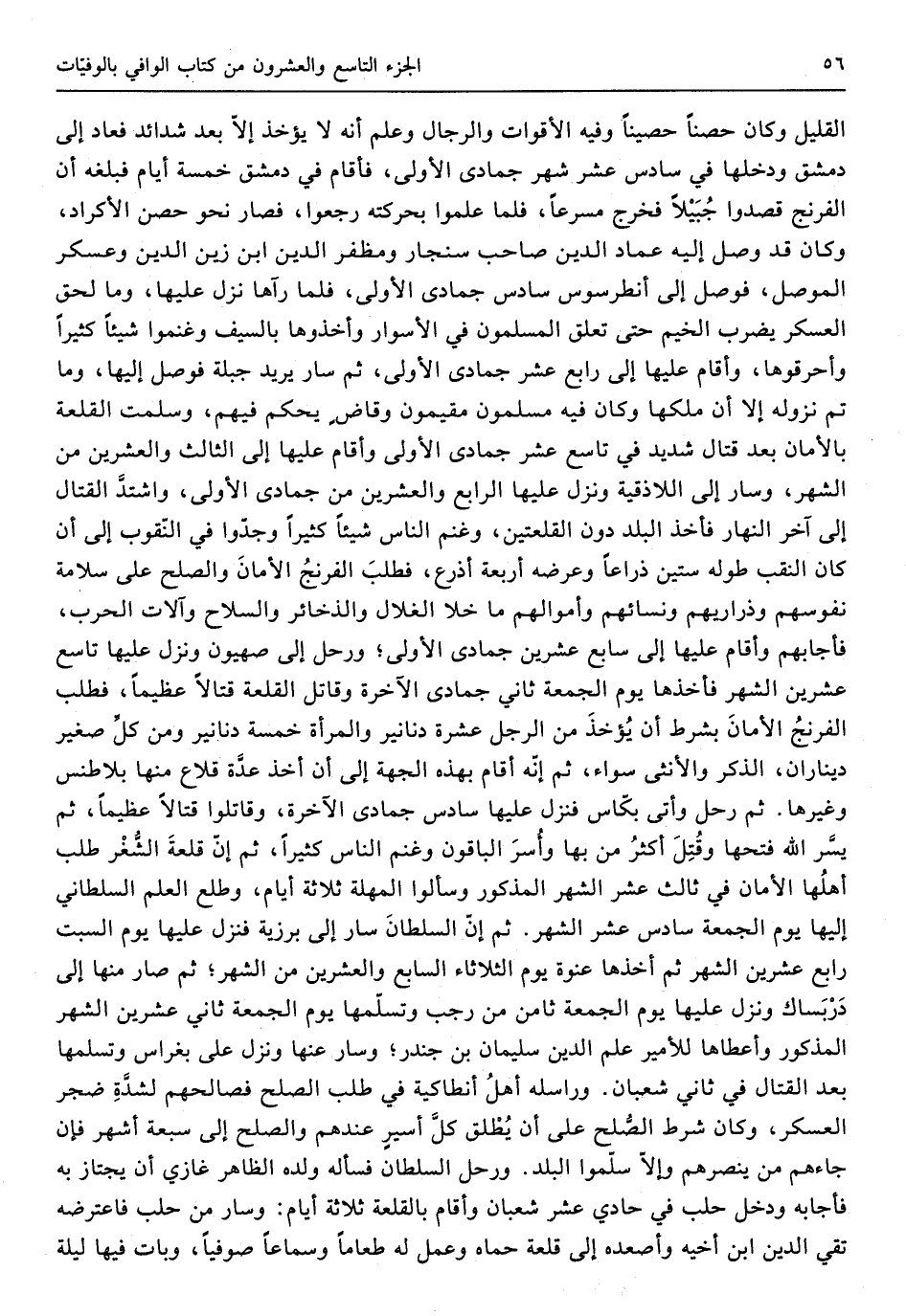 الْقَلِيل وَكَانَ حصنا حصينا وَفِيه الأقوات وَالرِّجَال وَعلم أَنه لَا يُؤْخَذ إِلَّا بعد شَدَائِد فَعَاد إِلَى دمشق ودخلها فِي سادس عشر شهر جُمَادَى الأولى فَأَقَامَ فِي دمشق خَمْسَة أَيَّام فَبَلغهُ أَن الفرنج قصدُوا جبيلا فَخرج مسرعا فَلَمَّا علمُوا بحركته رجعُوا فَصَارَ نَحْو حصن الأكراد وَكَانَ قد وصل إِلَيْهِ عماد الدّين صَاحب سنجار ومظفر الدّين ابْن زين الدّين وعسكر الْموصل فوصل إِلَى أنطرسوس سادس جُمَادَى الأولى فَلَمَّا رَآهَا نزل عَلَيْهَا وَمَا لحق الْعَسْكَر يضْرب الخيم حَتَّى تعلق الْمُسلمُونَ فِي الأسوار وأخذوها بِالسَّيْفِ وغنموا شَيْئا كثيرا وأحرقوها وَأقَام عَلَيْهَا إِلَى رَابِع عشر جُمَادَى الأولى ثمَّ سَار يُرِيد جبلة فوصل إِلَيْهَا وَمَا تمّ نُزُوله إِلَّا أَن ملكهَا وَكَانَ فِيهِ مُسلمُونَ مقيمون وقاض يحكم فيهم وسلمت القلعة بالأمان بعد قتال شَدِيد فِي تَاسِع عشر جُمَادَى الأولى وَأقَام عَلَيْهَا إِلَى الثَّالِث وَالْعِشْرين من الشَّهْر وَسَار إِلَى اللاذقية وَنزل عَلَيْهَا الرَّابِع وَالْعِشْرين من جُمَادَى الأولى وَاشْتَدَّ الْقِتَال إِلَى آخر النَّهَار فَأخذ الْبَلَد دون القلعتين وغنم النَّاس شَيْئا كثيرا وجدوا فِي النقوب إِلَى أَن كَانَ النقب طوله سِتِّينَ ذِرَاعا وَعرضه أَرْبَعَة أَذْرع فَطلب الفرنج الْأمان وَالصُّلْح على سَلامَة نُفُوسهم وذراريهم وَنِسَائِهِمْ وَأَمْوَالهمْ مَا خلا الغلال والذخائر وَالسِّلَاح وآلات الْحَرْب فأجابهم وَأقَام عَلَيْهَا إِلَى سَابِع عشْرين جُمَادَى الأولى ورحل إِلَى صهيون وَنزل عَلَيْهَا تَاسِع عشْرين الشَّهْر فَأَخذهَا يَوْم الْجُمُعَة ثَانِي جُمَادَى الْآخِرَة وَقَاتل القلعة قتالا عَظِيما فَطلب الفرنج الْأمان بِشَرْط أَن يُؤْخَذ من الرجل عشرَة دَنَانِير وَالْمَرْأَة خَمْسَة دَنَانِير وَمن كل صَغِير دِينَارَانِ الذّكر وَالْأُنْثَى سَوَاء ثمَّ إِنَّه أَقَامَ بِهَذِهِ الْجِهَة إِلَى أَن أَخذ عدَّة قلاع مِنْهَا بلاطنس وَغَيرهَا ثمَّ رَحل وأتى بكاس فَنزل عَلَيْهَا سادس جُمَادَى الْآخِرَة وقاتلوا قتالا عَظِيما ثمَّ يسر الله فتحهَا وَقتل أَكثر من بهَا وَأسر الْبَاقُونَ وغنم النَّاس كثيرا ثمَّ إِن قلعة الشغر طلب أَهلهَا الْأمان فِي ثَالِث عشر الشَّهْر الْمَذْكُور وسألوا المهلة ثَلَاثَة أَيَّام وطلع الْعلم السلطاني إِلَيْهَا يَوْم الْجُمُعَة سادس عشر الشَّهْر ثمَّ إِن السُّلْطَان سَار إِلَى برزية فَنزل عَلَيْهَا يَوْم السبت رَابِع عشْرين الشَّهْر ثمَّ أَخذهَا عنْوَة يَوْم الثُّلَاثَاء السَّابِع وَالْعِشْرين من الشَّهْر ثمَّ صَار مِنْهَا إِلَى دربساك وَنزل عَلَيْهَا يَوْم الْجُمُعَة ثامن من رَجَب وتسلمها يَوْم الْجُمُعَة ثَانِي عشْرين الشَّهْر الْمَذْكُور وَأَعْطَاهَا للأمير علم الدّين سُلَيْمَان بن جندر وَسَار عَنْهَا وَنزل على بغراس وتسلمها بعد الْقِتَال فِي ثَانِي شعْبَان وراسله أهل أنطاكية فِي طلب الصُّلْح فَصَالحهُمْ لشدَّة ضجر الْعَسْكَر وَكَانَ شَرط الصُّلْح على أَن يُطلق كل أَسِير عِنْدهم وَالصُّلْح إِلَى سَبْعَة أشهر فَإِن جَاءَهُم من ينصرهم وَإِلَّا سلمُوا الْبَلَد ورحل السُّلْطَان فَسَأَلَهُ وَلَده الظَّاهِر غَازِي أَن يجتاز بِهِ فَأَجَابَهُ وَدخل حلب فِي حادي عشر شعْبَان وَأقَام بالقلعة ثَلَاثَة أَيَّام وَسَار من حلب فاعترضه تَقِيّ الدّين ابْن أَخِيه وأصعده إِلَى قلعة حماه وَعمل لَهُ طَعَاما وسماعا صوفيا وَبَات فِيهَا لَيْلَة