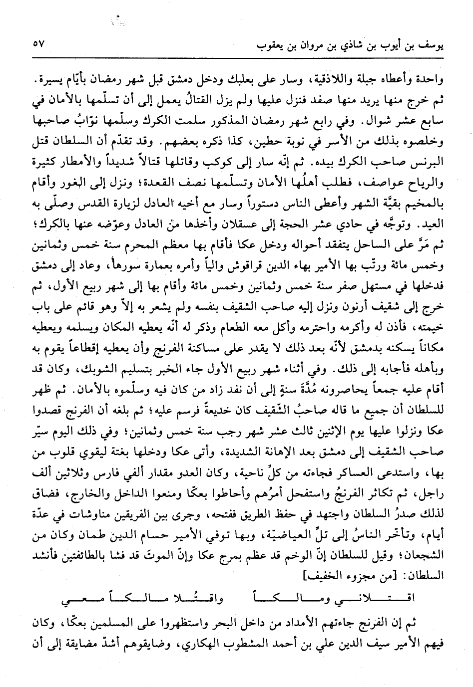 وَاحِدَة وَأَعْطَاهُ جبلة واللاذقية وَسَار على بعلبك وَدخل دمشق قبل شهر رَمَضَان بأيام يسيرَة ثمَّ خرج مِنْهَا يُرِيد مِنْهَا صفد فَنزل عَلَيْهَا وَلم يزل الْقِتَال يعْمل إِلَى أَن تسلمها بالأمان فِي سَابِع عشر شَوَّال وَفِي رَابِع شهر رَمَضَان الْمَذْكُور سلمت الكرك وَسلمهَا نواب صَاحبهَا وخلصوه بذلك من الْأسر فِي نوبَة حطين كَذَا ذكره بَعضهم وَقد تقدم أَن السُّلْطَان قتل الْبُرْنُس صَاحب الكرك بِيَدِهِ ثمَّ إِنَّه سَار إِلَى كَوْكَب وقاتلها قتالا شَدِيدا والأمطار كَثِيرَة والرياح عواصف فَطلب أَهلهَا الْأمان وتسلمها نصف الْقعدَة وَنزل إِلَى الْغَوْر وَأقَام بالمخيم بَقِيَّة الشَّهْر وَأعْطى النَّاس دستورا وَسَار مَعَ أَخِيه الْعَادِل لزيارة الْقُدس وَصلى بِهِ الْعِيد وَتوجه فِي حادي عشر الْحجَّة إِلَى عسقلان وَأَخذهَا من الْعَادِل وعوضه عَنْهَا بالكرك ثمَّ مر على السَّاحِل يتفقد أَحْوَاله وَدخل عكا فَأَقَامَ بهَا مُعظم الْمحرم سنة خمس وَثَمَانِينَ وَخمْس مائَة ورتب بهَا الْأَمِير بهاء الدّين قراقوش واليا وَأمره بعمارة سورها وَعَاد إِلَى دمشق فَدَخلَهَا فِي مستهل صفر سنة خمس وَثَمَانِينَ وَخمْس مائَة وَأقَام بهَا إِلَى شهر ربيع الأول ثمَّ خرج إِلَى شقيف أرنون وَنزل إِلَيْهِ صَاحب الشقيف بِنَفسِهِ وَلم يشْعر بِهِ إِلَّا وَهُوَ قَائِم على بَاب خيمته فَأذن لَهُ وأكرمه واحترمه وَأكل مَعَه الطَّعَام وَذكر لَهُ أَنه يُعْطِيهِ الْمَكَان ويسلمه وَيُعْطِيه مَكَانا يسكنهُ بِدِمَشْق لِأَنَّهُ بعد ذَلِك لَا يقدر على مساكنة الفرنج وَأَن يُعْطِيهِ إقطاعا يقوم بِهِ وبأهله فَأَجَابَهُ إِلَى ذَلِك وَفِي أثْنَاء شهر ربيع الأول جَاءَ الْخَبَر بِتَسْلِيم الشوبك وَكَانَ قد أَقَامَ عَلَيْهِ جمعا يحاصرونه مُدَّة سنة إِلَى أَن نفد زَاد من كَانَ فِيهِ وسلموه بالأمان ثمَّ ظهر للسُّلْطَان أَن جَمِيع مَا قَالَه صَاحب الشقيف كَانَ خديعة فرسم عَلَيْهِ ثمَّ بلغه أَن الْفرج قصدُوا عكا ونزلوا عَلَيْهَا يَوْم الِاثْنَيْنِ ثَالِث عشر شهر رَجَب سنة خمس وَثَمَانِينَ وَفِي ذَلِك الْيَوْم سير صَاحب الشقيف إِلَى دمشق بعد الإهانة الشَّدِيدَة وأتى عكا ودخلها بَغْتَة ليقوي قُلُوب من بهَا واستدعى العساكر فَجَاءَتْهُ من كل نَاحيَة وَكَانَ الْعَدو مِقْدَار ألفي فَارس وَثَلَاثِينَ ألف راجل ثمَّ تكاثر الفرنج واستفحل أَمرهم وَأَحَاطُوا بعكا وَمنعُوا الدَّاخِل وَالْخَارِج فَضَاقَ لذَلِك صدر السُّلْطَان واجتهد فِي حفظ الطَّرِيق ففتحه وَجرى بَين الْفَرِيقَيْنِ مناوشات فِي عدَّة أَيَّام وَتَأَخر النَّاس إِلَى تل العياضية وَبهَا توفّي الْأَمِير حسام الدّين طمان وَكَانَ من الشجعان وَقيل للسُّلْطَان إِن الوخم قد عظم بمرج عكا وَإِن الْمَوْت قد فَشَا بالطائفتين فَأَنْشد السُّلْطَان // (من مجزوء الْخَفِيف) //