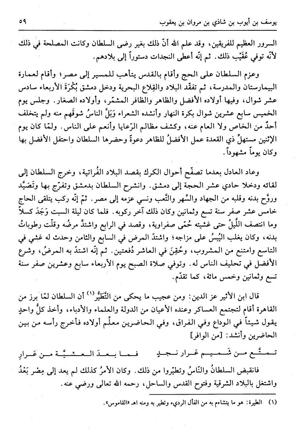 وعزم السُّلْطَان على الْحَج وَأقَام بالقدس يتأهب للمسير إِلَى مصر وَأقَام لعمارة البيمارستان والمدرسة ثمَّ تفقد الْبِلَاد والقلاع البحرية وَدخل دمشق بكرَة الْأَرْبَعَاء سادس عشر شَوَّال وفيهَا أَوْلَاده الْأَفْضَل وَالظَّاهِر والظافر المشمر وَأَوْلَاده الصغار وَجلسَ يَوْم الْخَمِيس سَابِع عشْرين شَوَّال بكرَة النَّهَار وأنشده الشُّعَرَاء وبل النَّاس شوقهم مِنْهُم وَلم يتَخَلَّف أحد من الْخَاص وَلَا الْعَام عَنهُ وكشف مظالم الرعايا وأنعم على النَّاس وَلما كَانَ يَوْم الِاثْنَيْنِ مستهل ذِي الْقعدَة عمل الْأَفْضَل للظَّاهِر دَعْوَة وحضرها السُّلْطَان واحتفل الْأَفْضَل بهَا وَكَانَ يَوْمًا مشهودا
