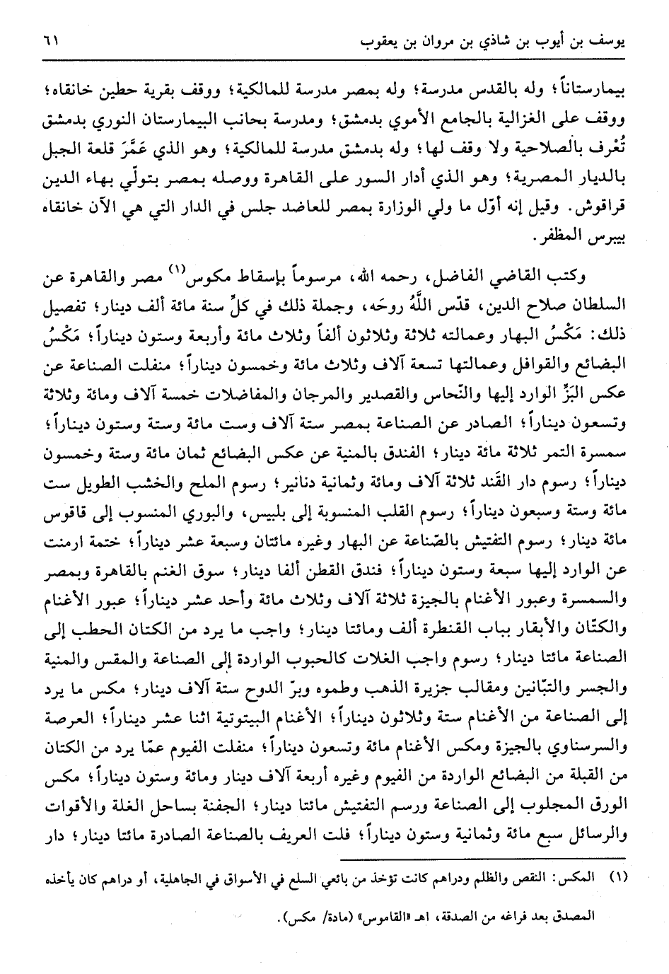 وَكتب القَاضِي الْفَاضِل رَحمَه الله مرسوما بِإِسْقَاط مكوس مصر والقاهرة عَن السُّلْطَان صَلَاح الدّين قدس الله روحه وَجُمْلَة ذَلِك فِي كل سنة مائَة ألف دِينَار تَفْصِيل ذَلِك مكس البهار وعمالته ثَلَاثَة وَثَلَاثُونَ ألفا وَثَلَاث مائَة وَأَرْبَعَة وَسِتُّونَ دِينَارا مكس البضائع والقوافل وعمالتها تِسْعَة آلَاف وَثَلَاث مائَة وَخَمْسُونَ دِينَارا منفلت الصِّنَاعَة عَن عكس الْبَز الْوَارِد إِلَيْهَا والنحاس والقصدير والمرجان والمفاضلات خَمْسَة آلَاف وَمِائَة وَثَلَاثَة وَتسْعُونَ دِينَارا الصَّادِر عَن الصِّنَاعَة بِمصْر سِتَّة آلَاف وست مائَة وَسِتَّة وَسِتُّونَ دِينَارا سمسرة التَّمْر ثَلَاثَة مائَة دِينَار الفندق بالمنية عَن عكس البضائع ثَمَان مائَة وَسِتَّة وَخَمْسُونَ دِينَارا رسوم دَار القند ثَلَاثَة آلَاف وَمِائَة وَثَمَانِية دَنَانِير رسوم الْملح والخشب الطَّوِيل سِتّ مائَة وَسِتَّة وَسَبْعُونَ دِينَارا رسوم الْقلب المنسوبة إِلَى بلبيس والبوري الْمَنْسُوب إِلَى قاقوس مائَة دِينَار رسوم التفتيش بالصناعة عَن البهار وَغَيره مِائَتَان وَسَبْعَة عشر دِينَارا ختمة ارمنت عَن الْوَارِد إِلَيْهَا سَبْعَة وَسِتُّونَ دِينَارا فندق الْقطن ألفا دِينَارا سوق الْغنم بِالْقَاهِرَةِ وبمصر والسمسرة وعبور الأغنام بالجيزة ثَلَاثَة آلَاف وَثَلَاث مائَة وَأحد عشر دِينَارا عبور الأغنام والكتان والأبقار بِبَاب القنطرة ألف وَمِائَتَا دِينَار وَاجِب مَا يرد من الْكَتَّان الْحَطب إِلَى الصِّنَاعَة مِائَتَا دِينَار رسوم وَاجِب الغلات كالحبوب الْوَارِدَة إِلَى الصِّنَاعَة والمقس والمنية والجسر والتبانين ومقالب جَزِيرَة الذَّهَب وطموه وبر الدوح سِتَّة آلَاف دِينَار مكس مَا يرد إِلَى الصِّنَاعَة من الأغنام سِتَّة وَثَلَاثُونَ دِينَارا الأغنام البيتوتية اثْنَا عشر دِينَارا الْعَرَصَة والسرسناوي بالجيزة ومكس الأغنام مائَة وَتسْعُونَ دِينَارا منفلت الفيوم عَمَّا يرد من الْكَتَّان من الْقبْلَة من البضائع الْوَارِدَة من الفيوم وَغَيره أَرْبَعَة آلَاف دِينَار وَمِائَة وَسِتُّونَ دِينَارا مكس الْوَرق المجلوب إِلَى الصِّنَاعَة ورسم التفتيش مِائَتَا دِينَار الْجَفْنَة بساحل الْغلَّة والأقوات والرسائل سبع مائَة وَثَمَانِية وَسِتُّونَ دِينَار فَلت العريف بالصناعة الصادرة مِائَتَا دِينَار دَار