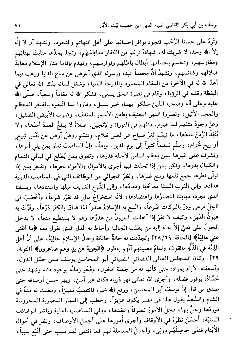 وَترد على حمانا الرحب فتجود بوافر إحسانها على أهل التهائم والنجود ونشهد أَن لَا إِلَه إِلَّا الله وَحده لَا شريك لَهُ شَهَادَة ترغم من الْكفَّار معاطسهم وتجذ بحدها منابت بهتانهم ومغارسهم وتحسم بحسامها أبطال باطلهم وفوراسهم وتهدم بِإِقَامَة منار الْإِسْلَام معابد ضلالهم وكنائسهم ونشهد أَن مُحَمَّدًا عَبده وَرَسُوله الَّذِي أعرض عَن مَتَاع الدُّنْيَا وَرغب فِيمَا أعده الله لَهُ فِي الْآخِرَة من الْمقَام الْمَحْمُود والدرجة الْعليا وشغل لِسَانه بِذكر الله تَعَالَى فِي الْيَقَظَة وَقَلبه فِي الرُّؤْيَا وَقَامَ فِي نصْرَة الْحق يسْعَى فَشكر الله لَهُ مقَاما وسعيا صلى الله عَلَيْهِ وَسلم وعَلى آله وصبحه الَّذين سلكوا بهداه خير سَبِيل وفازوا لما اتَّبعُوهُ بالفخر الْمُعظم وَالْمجد الأثيل ونصروا الدّين الحنيف بطعن الأسمر المثقف وَضرب الْأَبْيَض الصَّقِيل وَعز جود مثلهم لما ضرب مثلهم فِي التَّوْرَاة وَالْإِنْجِيل صَلَاة لَا يبلغ الْعدَد أمدها وَلَا ينفذ الزَّمن مددها مَا تَبَسم ثغر صباح عَن لعس ظلام وتنسم روض أَرض عَن نفس شيح أَو ريح خزام وَسلم تَسْلِيمًا كثيرا إِلَى يَوْم الدّين وَبعد فَإِن المناصب تعلو بِمن يَلِي أمرهَا وتشرف على غَيرهَا بِمن يعظم النَّاس لأَجله قدرهَا وتفوق بِمن يطلع فِي ليَالِي التَّمام والكمال بدرها وتكبر بِمن إِذا تحدث فِيهَا أجْرى بالأموال والأمواه بحرها وتفخر بِمن إِذا تولى نظرها جمع نَفعهَا وَمنع ضرها وَنظر الجوالي من الْوَظَائِف الَّتِي فِي المناصب الدِّينِيَّة عدادها وَإِلَى الْقرب السّنيَّة معاجها ومعادها وَإِلَى الشَّرْع الشريف ميلها واستنادها وبسيفنا الَّذِي تجرده مهابتنا انتصارها واعتضادها لِأَنَّهُ اسْتِخْرَاج مَال قد تقرر شرعا وأخصب فِي الْحل مرعى ودر بالبركات ضرعا واتسع بِهِ الْإِسْلَام صَدرا لما ضَاقَ بالْكفْر ذرعا وقرت بِهِ عُيُون الدّين وَكَيف لَا تقر إِذا أخذت الْعُيُون من عدوها وَهُوَ لَا يَسْتَطِيع منعا لَا يدْخل الْحول على ذمِّي إِلَّا جَاءَ إِلَيْهِ من يطْلب الجالية وأحاط بِهِ الذل الَّذِي يَقُول مَعَه {مَا أغْنى عني ماليه} الحاقة 69 / 28 وتجددت لَهُ حَالَة حالكة وَحَال الْإِسْلَام حاليه على أَن أهل الذِّمَّة فِي الذلة مائقون وَتَمام مصيبتهم أَنهم يُعْطون {الْجِزْيَة عَن يَد وهم صاغرون} التَّوْبَة 29 وَكَانَ الْمجْلس العالي القضائي الضيائي أَبُو المحاسن يُوسُف مِمَّن جمل الدولة وأسعفته الْأَيَّام بمراده حَتَّى كَأَنَّهَا لَهُ من جملَة الخول وفخر زَمَانه بِوُجُود مثله وَشهد حَتَّى حساده بوفور فَضله وأجرى الله تَعَالَى نهر ذُريَّته فَكَانَ غير آسن وبهر حسن أَوْصَافه حَتَّى صدق من قَالَ إِن يُوسُف أَبُو المحاسن وَرفع الله خَبره فانتصب تمييزا وَمَضَت لَهُ مُدَّة فِي الشَّام والسعد يَقُول هَذَا فِي مصر يكون عَزِيزًا وخطب إِلَى الديار المصرية المحروسة فوردها وَحل بهَا فَحل الْأُمُور تَصرفا وعقدها وَولي المناصب الْعلية وباشر الْوَظَائِف السّنيَّة أحسن نظره فِي الْأَوْقَاف وأجرى أمورها على أجمل الْأَوْصَاف وَنظر فِي أَمْوَال الْأَيْتَام فنمى حاصلهم وربى وأجمل الْمُعَامَلَة لَهُم فَمَا انْتهى لَهُم سَبَب حَتَّى أتبع سَببا