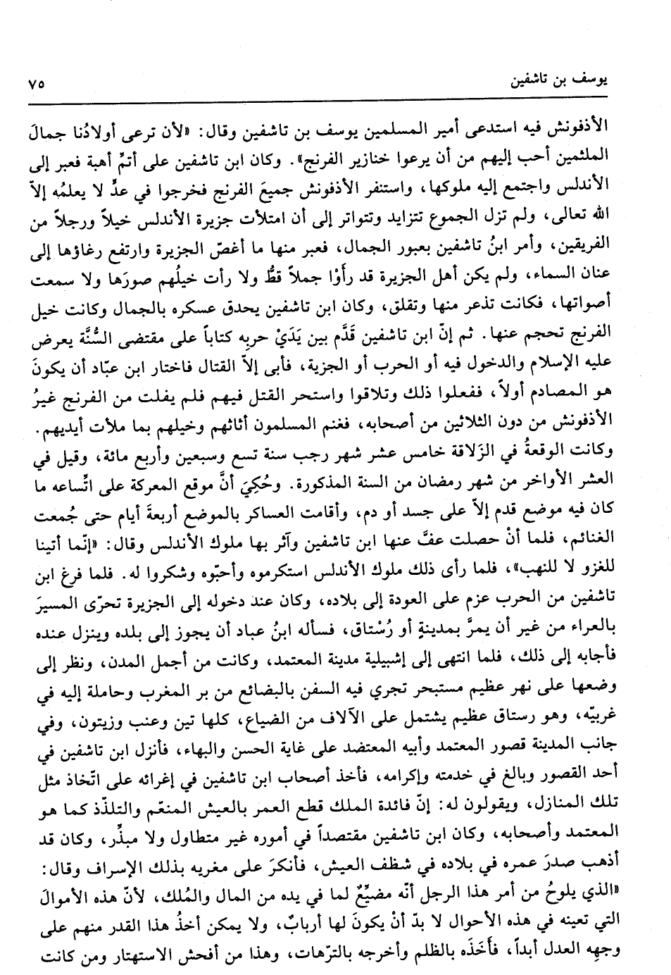 الأذفونش فِيهِ استدعى أَمِير الْمُسلمين يُوسُف بن تاشفين وَقَالَ لِأَن ترعى أَوْلَادنَا جمال الملثمين أحب إِلَيْهِم من أَن يرعوا خنازير الفرنج وَكَانَ ابْن تاشفين على أتم أهبة فَعبر إِلَى الأندلس وَاجْتمعَ إِلَيْهِ مُلُوكهَا واستنفر الأذفونش جَمِيع الفرنج فَخَرجُوا فِي عد لَا يُعلمهُ إِلَّا الله تَعَالَى وَلم تزل الجموع تتزايد وتتواتر إِلَى أَن امْتَلَأت جَزِيرَة الأندلس خيلا ورجلا من الْفَرِيقَيْنِ وَأمر ابْن تاشفين بعبور الْجمال فَعبر مِنْهَا مَا أغص الجزيرة وارتفع رغاؤها إِلَى عنان السَّمَاء وَلم يكن أهل الجزيرة قد رَأَوْا جملا قطّ وَلَا رَأَتْ خيلهم صورها وَلَا سَمِعت أصواتها فَكَانَت تذْعَر مِنْهَا وتقلق وَكَانَ ابْن تاشفين يحدق عسكره بالجمال وَكَانَت خير الفرنج تحجم عَنْهَا ثمَّ ابْن تاشفين قدم بَين يَدي حربه كتابا على مُقْتَضى السّنة يعرض عَلَيْهِ الْإِسْلَام وَالدُّخُول فِيهِ أَو الْحَرْب أَو الْجِزْيَة فَأبى إِلَّا الْقِتَال فَاخْتَارَ ابْن عباد أَن يكون هُوَ المصادم أَولا فَفَعَلُوا ذَلِك وتلاقوا واستحر الْقَتْل فيهم فَلم يفلت من الفرنج غير الأذفونش من دون الثَّلَاثِينَ من أَصْحَابه فغنم الْمُسلمُونَ أثاثهم وخيلهم بِمَا مَلَأت أَيْديهم وَكَانَت الْوَقْعَة فِي الزلاقة خَامِس عشر شهر رَجَب سنة تسع وَسبعين وَأَرْبع مائَة وَقيل فِي الْعشْر الْأَوَاخِر من شهر رَمَضَان من السّنة الْمَذْكُورَة وَحكي أَن موقع المعركة على اتساعه مَا كَانَ فِيهِ مَوضِع قدم إِلَّا على جَسَد أَو دم وأقامت العساكر بالموضع أَرْبَعَة أَيَّام حَتَّى جمعت الْغَنَائِم فَلَمَّا لِأَن حصلت عف عَنْهَا ابْن تاشفين وآثر بهَا مُلُوك الأندلس وَقَالَ إِنَّمَا أَتَيْنَا للغزو لَا للنهب فَلَمَّا رأى ذَلِك مُلُوك الأندلس استكرموه وأحبوه وشكروا لَهُ فَلَمَّا فرغ ابْن تاشفين من الْحَرْب عزم على العودة إِلَى بِلَاده وَكَانَ عِنْد دُخُوله إِلَى الجزيرة تحرى الْمسير بالعراء من غير أَن يمر بِمَدِينَة أَو رستاق فَسَأَلَهُ ابْن عباد أَن يجوز إِلَى بَلَده وَينزل عِنْده فَأَجَابَهُ إِلَى ذَلِك فَلَمَّا انْتهى إِلَى إشبيلية مَدِينَة الْمُعْتَمد وَكَانَت من أجمل المدن وَنظر إِلَى وَضعهَا على نهر عَظِيم مستبحر تجْرِي فِيهِ السفن بالبضائع من بر الْمغرب وحاملة إِلَيْهِ فِي غربيه وَهُوَ رستاق عَظِيم يشْتَمل على الآلاف من الضّيَاع كلهَا تين وعنب وزيتون وَفِي جَانب الْمَدِينَة قُصُور الْمُعْتَمد وَأَبِيهِ المعتضد على غَايَة الْحسن والبهاء فَأنْزل ابْن تاشفين أحد الْقُصُور وَبَالغ فِي خدمته وإكرامه فَأخذ أَصْحَاب ابْن تاشفين فِي إغرائه على اتِّخَاذ مثل تِلْكَ الْمنَازل وَيَقُولُونَ لَهُ إِن فَائِدَة الْملك قطع الْعُمر بالعيش الْمُنعم والتلذذ كَمَا هُوَ الْمُعْتَمد وَأَصْحَابه وَكَانَ ابْن تاشفين مقتصدا فِي أُمُوره غير متطاول وَلَا مبذر وَكَانَ قد أذهب صدر عمره فِي بِلَاد فِي شظف الْعَيْش فَأنْكر على مغريه بذلك الْإِسْرَاف وَقَالَ الَّذِي يلوح من أَمر هَذَا الرجل أَنه مضيع لما فِي يَده من المَال وَالْملك لِأَن هَذِه الْأَمْوَال الَّتِي تعينه فِي هَذِه الْأَحْوَال لَا بُد أَن يكون لَهَا أَرْبَاب وَلَا يُمكن أَخذ هَذَا الْقدر مِنْهُم على وَجهه الْعدْل أبدا فَأَخذه بالظلم وَأخرجه بالترهات وَهَذَا من أفحش الاستهتار وَمن كَانَت
