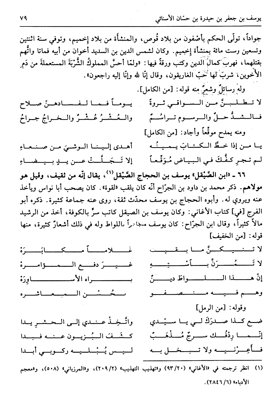 66 - ابْن الصيقل يُوسُف بن الْحجَّاج الصيقل يُقَال إِنَّه من ثَقِيف وَقيل هُوَ مَوْلَاهُم ذكر مُحَمَّد بن دَاوُد بن الْجراح أَنه كَانَ يلقب لقُوَّة كَانَ يصحب أَبَا نواس وَيَأْخُذ عَنهُ ويروي لَهُ وَأَبوهُ الْحجَّاج بن يُوسُف مُحدث ثِقَة روى عَنهُ جمَاعَة كَثِيرَة ذكره أَبُو الْفرج فِي كتاب الأغاني وَكَانَ يُوسُف بن الصَّقِيل كَاتب سر بِالْكُوفَةِ أَخذ من الرشيد مَالا كثيرا وَقَالَ ابْن الْجراح كَانَ يُوسُف مبادرا باللواط وَله فِي ذَلِك أشعار كَثِيرَة مِنْهَا قَوْله // (من الْخَفِيف) //