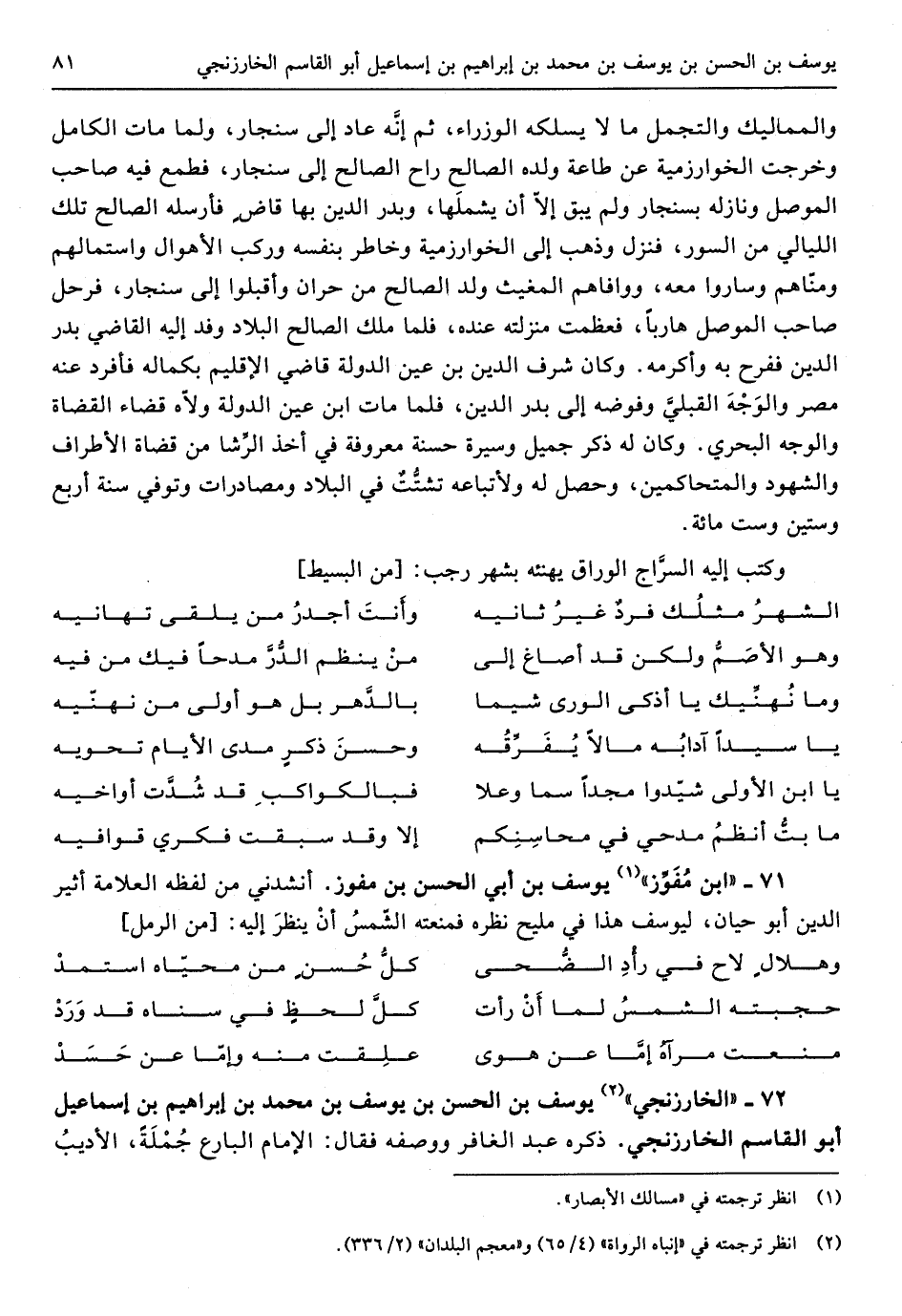 72 - الخارزنجي يُوسُف بن الْحسن بن يُوسُف بن مُحَمَّد بن إِبْرَاهِيم بن إِسْمَاعِيل أَبُو الْقَاسِم الخارزنجي ذكره عبد الغافر وَوَصفه فَقَالَ الإِمَام البارع جملَة الأديب