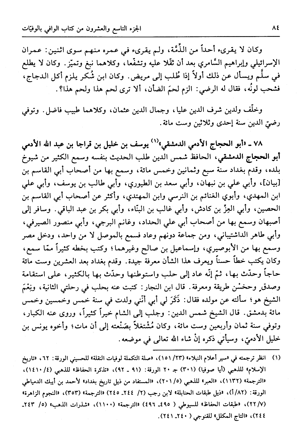 78 - أَبُو الْحجَّاج الأدمِيّ الدِّمَشْقِي يُوسُف بن خَلِيل بن قراجا بن عبد الله الأدمِيّ ابْن الْحجَّاج الدِّمَشْقِي الْحَافِظ شمس الدّين طلب الحَدِيث بِنَفسِهِ وَسمع الْكثير من شُيُوخ بَلَده وَقدم بَغْدَاد سنة سبع وَثَمَانِينَ وَخمْس مائَة وَسمع بهَا من أَصْحَاب أبي الْقَاسِم بن بَيَان وَأبي عَليّ بن نَبهَان وَأبي سعد بن الطيوري وَأبي طَالب بن يُوسُف وَأبي عَليّ ابْن الْمهْدي وأبوي الْغَنَائِم بن النَّرْسِي وَابْن الْمُهْتَدي وَأكْثر عَن أَصْحَاب أبي الْقَاسِم بن الْحصين وَأبي الْعِزّ بن كادش وَأبي غَالب بن الْبناء وَأبي بكر بن عبد الْبَاقِي وسافر إِلَى أَصْبَهَان وَسمع بهَا من أَصْحَاب أبي عَليّ الْحداد وغانم الْبُرْجِي وَأبي مَنْصُور الصَّيْرَفِي وَأبي طَاهِر الداشتيباني وَمن جمَاعَة دونهم وَعَاد فَسمع بالموصل لَا من وَاحِد وَدخل مصر وَسمع بهَا من الأبوصيري وَإِسْمَاعِيل بن صَالح وَغَيرهمَا وَكتب بِخَطِّهِ كثيرا مِمَّا سمع وَكَانَ يكْتب خطا حسنا وَيعرف هَذَا الشَّأْن معرفَة جَيِّدَة وَقدم بَغْدَاد بعد الْعشْرين وست مائَة حَاجا وَحدث بهَا ثمَّ إِنَّه عَاد إِلَى حلب واستوطنها وَحدث بهَا بالكثير على استقامة وَصدق وحخسن وَمَعْرِفَة قَالَ ابْن النجار كتبت عَنهُ بحلب فِي رحلتي الثَّانِيَة وَنعم الشَّيْخ هُوَ سَأَلته عَن مولده فَقَالَ ذكر لي أبي أنني ولدت فِي سنة خمس وَخمسين وَخمْس مائَة بِدِمَشْق قَالَ الشَّيْخ شمس الدّين وجلب إِلَى الشَّام خيرا كثيرا وروى عَنهُ الْكِبَار وَتُوفِّي سنة ثَمَان وَأَرْبَعين وست مائَة وَكَانَ مشتغلا بصنعته إِلَى أَن مَاتَ وَأَخُوهُ يُونُس بن خَلِيل الأدمِيّ وَسَيَأْتِي ذكره إِن شَاءَ الله تَعَالَى فِي مَوْضِعه