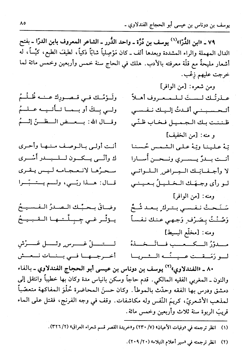 80 - الفندلاوي يُوسُف بن دوناس بن عِيسَى أَبُو الْحجَّاج الفندلاوي بِالْفَاءِ وَالنُّون المغربي الْفَقِيه الْمَالِكِي قدم حَاجا وَسكن بانياس مُدَّة وَكَانَ بهَا خَطِيبًا وانتقل إِلَى دمشق ودرس بهَا الْفِقْه وَحدث بالموطأ وَكَانَ حسن المحاضرة حُلْو المفاكهة متعصبا لمَذْهَب الْأَشْعَرِيّ كريم النَّفس وَله مكاشفات وقف فِي وَجه الفرنج فَقتل على المَاء قريب الربوة سنة ثَلَاث وَأَرْبَعين وَخمْس مائَة