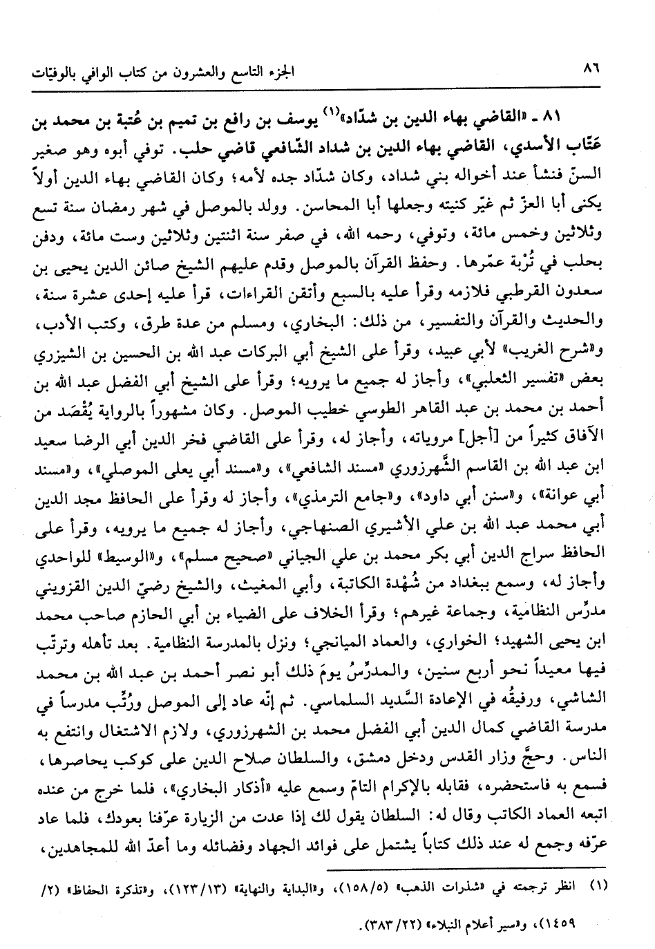 81 - القَاضِي بهاء الدّين بن شَدَّاد يُوسُف بن رَافع بن تَمِيم بن عتبَة بن مُحَمَّد بن عتاب الْأَسدي القَاضِي بهاء الدّين بن شَدَّاد الشَّافِعِي قَاضِي حلب توفّي أَبوهُ وَهُوَ صَغِير السن فَنَشَأَ عِنْد أَخْوَاله بني شَدَّاد وَكَانَ شَدَّاد جده لأمه وَكَانَ القَاضِي بهاء الدّين أَولا يكنى أَبَا الْعِزّ ثمَّ غير كنيته وَجعلهَا أَبَا المحاسن وَولد بالموصل فِي شهر رَمَضَان سنة تسع وَثَلَاثِينَ وَخمْس مائَة وَتُوفِّي رَحمَه الله فِي صفر سنة اثْنَتَيْنِ وَثَلَاثِينَ وست مائَة وَدفن بحلب فِي تربة عمرها وَحفظ الْقُرْآن بالموصل وَقدم عَلَيْهِم الشَّيْخ صائن الدّين يحيى بن سعدون الْقُرْطُبِيّ فلازمه وَقَرَأَ عَلَيْهِ بالسبع وأتقن الْقرَاءَات قَرَأَ عَلَيْهِ إِحْدَى عشرَة سنة والْحَدِيث وَالْقُرْآن وَالتَّفْسِير من ذَلِك البُخَارِيّ وَمُسلم من عدَّة طرق وَكتب الْأَدَب وَشرح الْغَرِيب لأبي عبيد وَقَرَأَ على الشَّيْخ أبي البركات عبد الله بن الْحُسَيْن بن الشيزري بعض تَفْسِير الثَّعْلَبِيّ وَأَجَازَ لَهُ جَمِيع مَا يرويهِ وَقَرَأَ على الشَّيْخ أبي الْفضل عبد الله بن أَحْمد بن مُحَمَّد بن عبد القاهر الطوسي خطيب الْموصل وَكَانَ مَشْهُورا بالرواية يقْصد من الْآفَاق كثيرا من أجل مروياته وَأَجَازَ لَهُ وَقَرَأَ على القَاضِي فَخر الدّين أبي الرِّضَا سعيد ابْن عبد الله بن الْقَاسِم الشهرزوري مُسْند الشَّافِعِي ومسند أبي يعلى الْموصِلِي ومسند أبي عوَانَة وَسنَن أبي دَاوُد وجامع التِّرْمِذِيّ وَأَجَازَ لَهُ وَقَرَأَ على الْحَافِظ مجد الدّين أبي مُحَمَّد عبد الله بن عَليّ الأشيري الصنهاجي وَأَجَازَ لَهُ جَمِيع مَا يرويهِ وَقَرَأَ على الْحَافِظ سراج الدّين أبي بكر مُحَمَّد بن عَليّ الجياني صَحِيح مُسلم والوسيط لِلْوَاحِدِيِّ وَأَجَازَ لَهُ وَسمع بِبَغْدَاد من شهدة الكاتبة وَأبي المغيث وَالشَّيْخ رَضِي الدّين الْقزْوِينِي مدرس النظامية وَجَمَاعَة غَيرهم وَقَرَأَ الْخلاف على الضياء بن أبي الحازم صَاحب مُحَمَّد ابْن يحيى الشَّهِيد الخواري والعماد الميانجي وَنزل بِالْمَدْرَسَةِ النظامية بعد تأهله وترتب فِيهَا معيدا نَحْو أَربع سِنِين والمدرس يَوْم ذَلِك أَبُو نصر أَحْمد بن عبد الله بن مُحَمَّد الشَّاشِي ورفيقه فِي الْإِعَادَة السديد السلماسي ثمَّ إِنَّه عَاد إِلَى الْموصل ورتب مدرسا فِي مدرسة القَاضِي كَمَال الدّين أبي الْفضل مُحَمَّد بن الشهرزوري ولازم الِاشْتِغَال وانتفع بِهِ النَّاس وَحج وزار الْقُدس وَدخل دمشق وَالسُّلْطَان صَلَاح الدّين على كَوْكَب يحاصرها فَسمع بِهِ فَاسْتَحْضرهُ فقابله بالإكرام التَّام وَسمع عَلَيْهِ أذكار البُخَارِيّ فَلَمَّا خرج من عِنْده اتبعهُ الْعِمَاد الْكَاتِب وَقَالَ لَهُ السُّلْطَان يَقُول لَك إِذا عدت من الزِّيَارَة عرفنَا بعودك فَلَمَّا عَاد عرفه وَجمع لَهُ عِنْد ذَلِك كتابا يشْتَمل على فَوَائِد الْجِهَاد وفضائله وَمَا أعد الله للمجاهدين