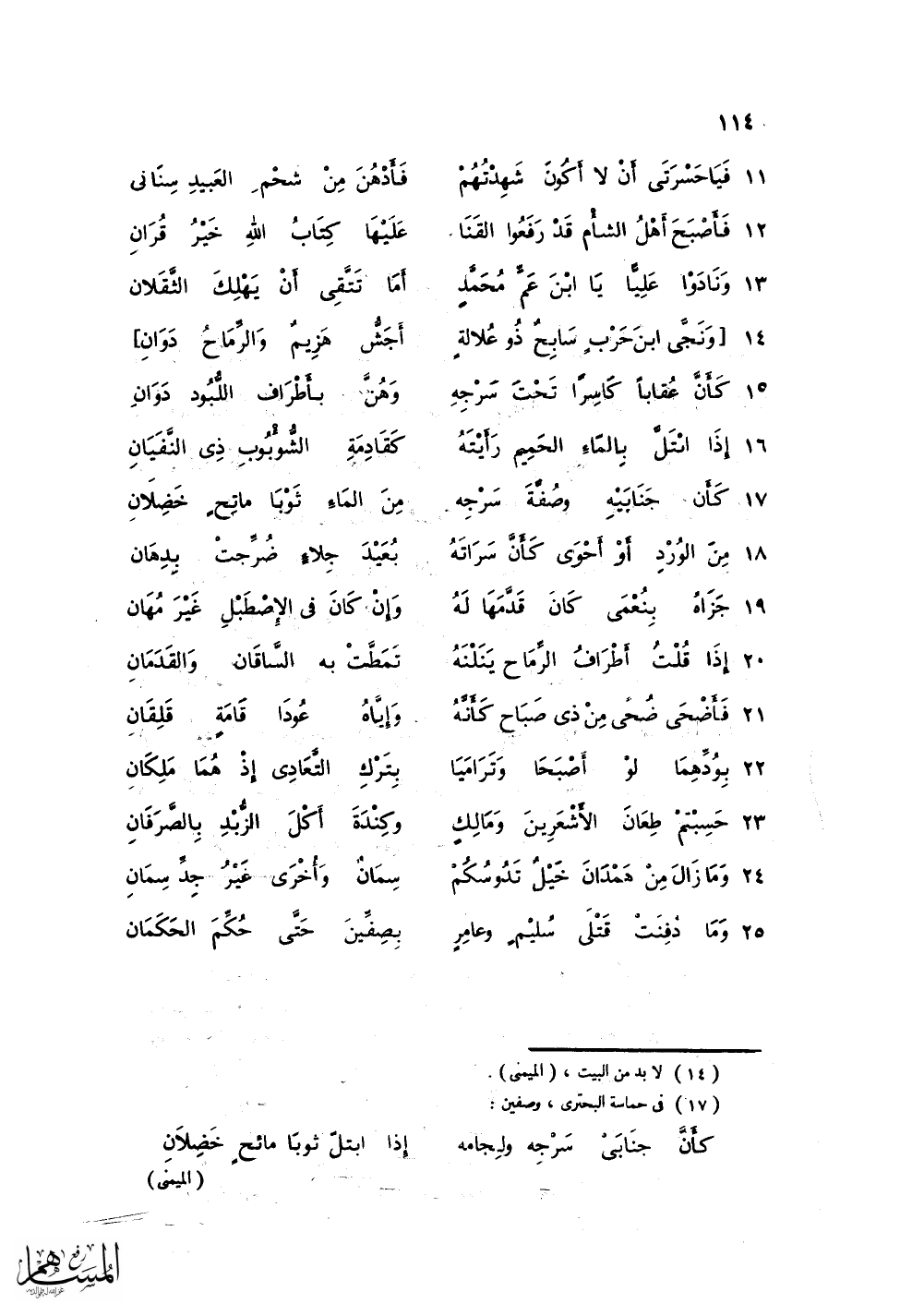 فَيَا حَسْرَتَي أَنْ لاَ أَكُونَ شَهِدْتَهُمْ ... فَأَدْهُنَ مِنْ شَحْمِ العَبِيدِ سِنَانِي