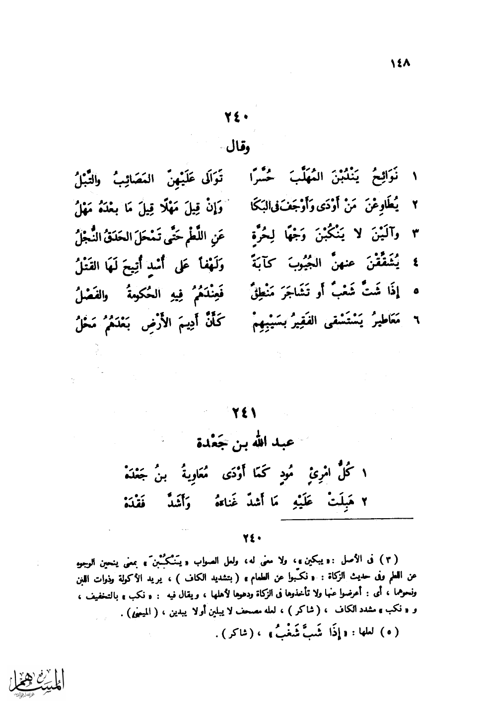 نَوَائِحُ يَنْدُبْنَ المُهَلَّبَ حُسَّراً ... تَوَالَى عَلَيْهِنَّ المَصَائِبُ والتَّبْلُ